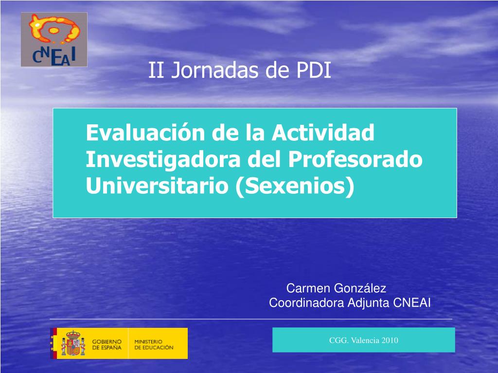 II Jornadas de PDI Evaluación de la Actividad Investigadora del Profesorado Universitario (Sexenios) Carmen González Coordinadora Adjunta CNEAI CGG. Valencia 2010
