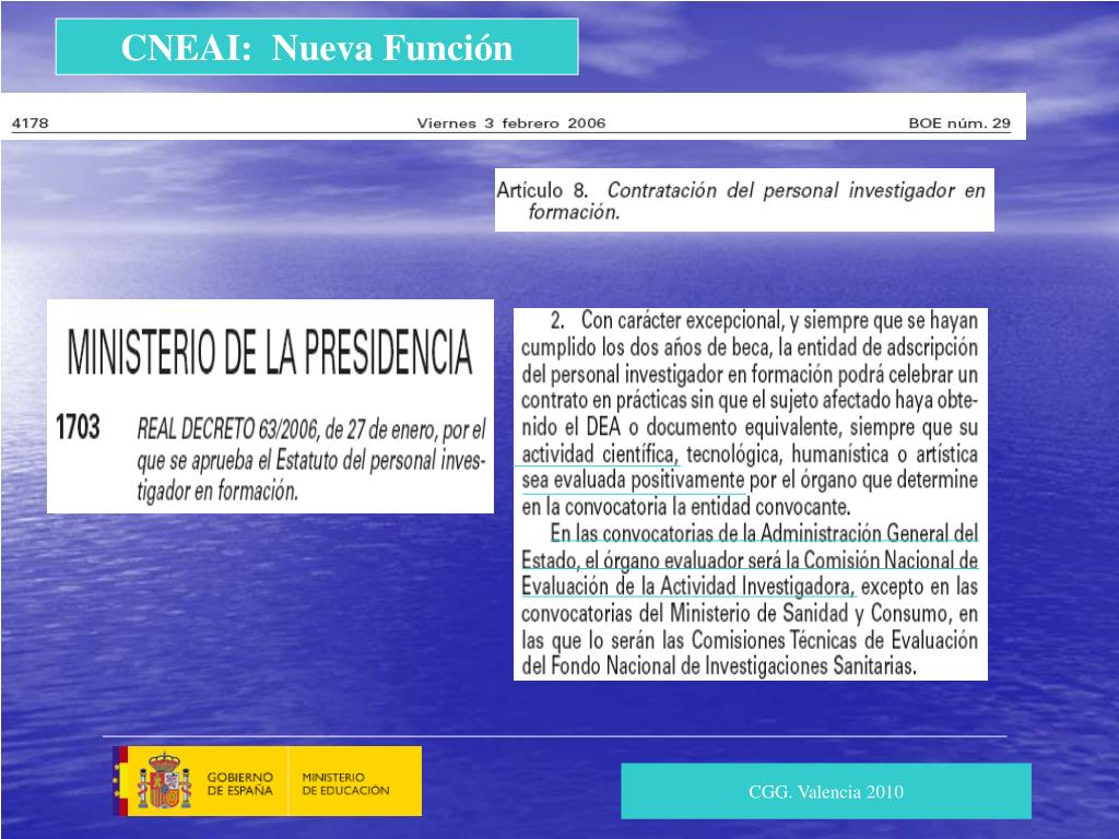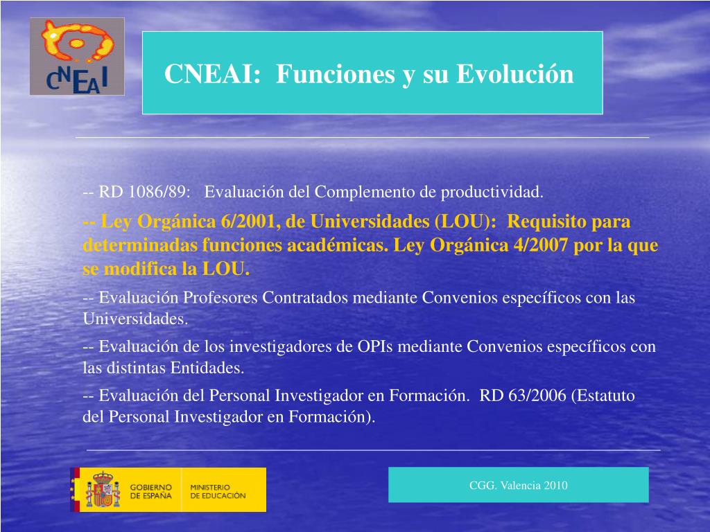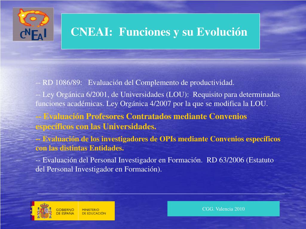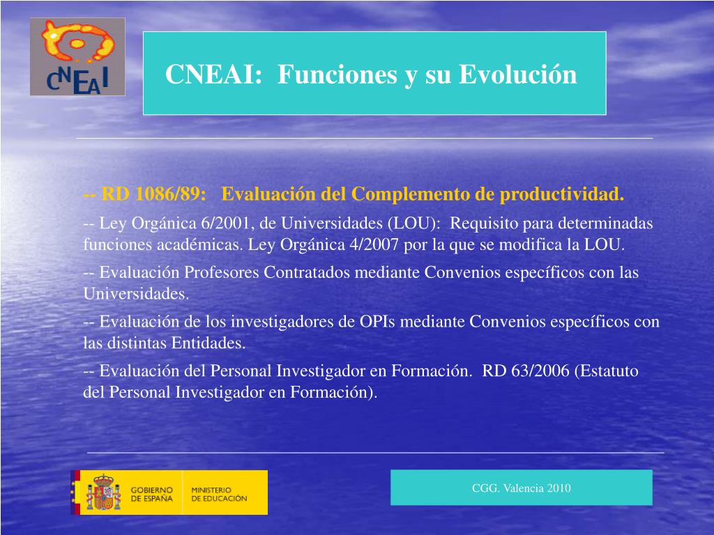 CNEAI: Funciones y su Evolución -- RD 1086/89: Evaluación del Complemento de productividad. -- Ley Orgánica 6/2001, de Universidades (LOU): Requisito para determinadas funciones académicas. Ley Orgánica 4/2007 por la que se modifica la LOU. -- Evaluación Profesores Contratados mediante Convenios específicos con las Universidades. -- Evaluación de los investigadores de OPIs mediante Convenios específicos con las distintas Entidades. -- Evaluación del Personal Investigador en Formación. RD 63/2006 (Estatuto del Personal Investigador en Formación). CGG. Valencia 2010
