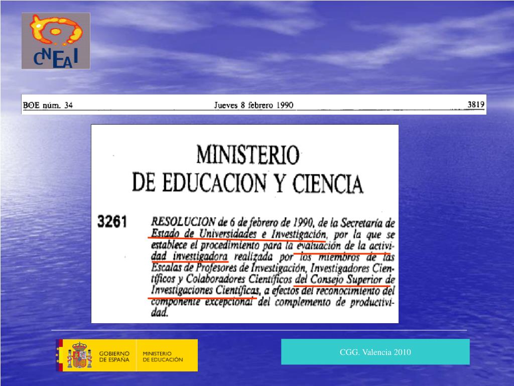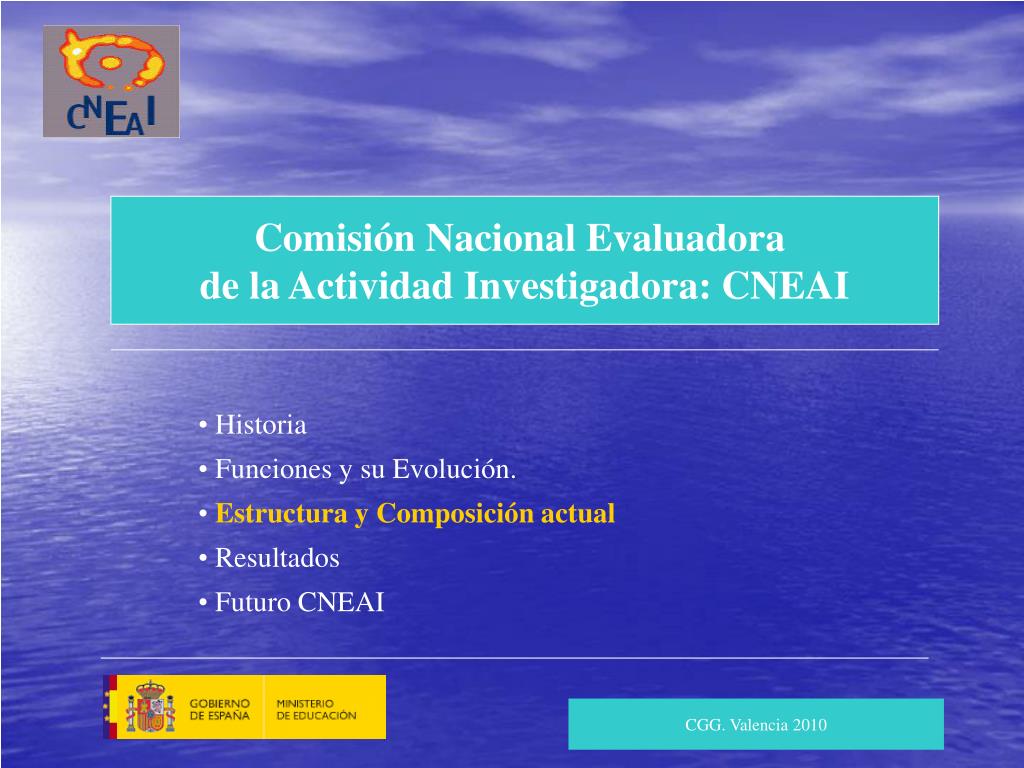 Comisión Nacional Evaluadora de la Actividad Investigadora: CNEAI • Historia • Funciones y su Evolución. • Estructura y Composición actual • Resultados • Futuro CNEAI CGG. Valencia 2010