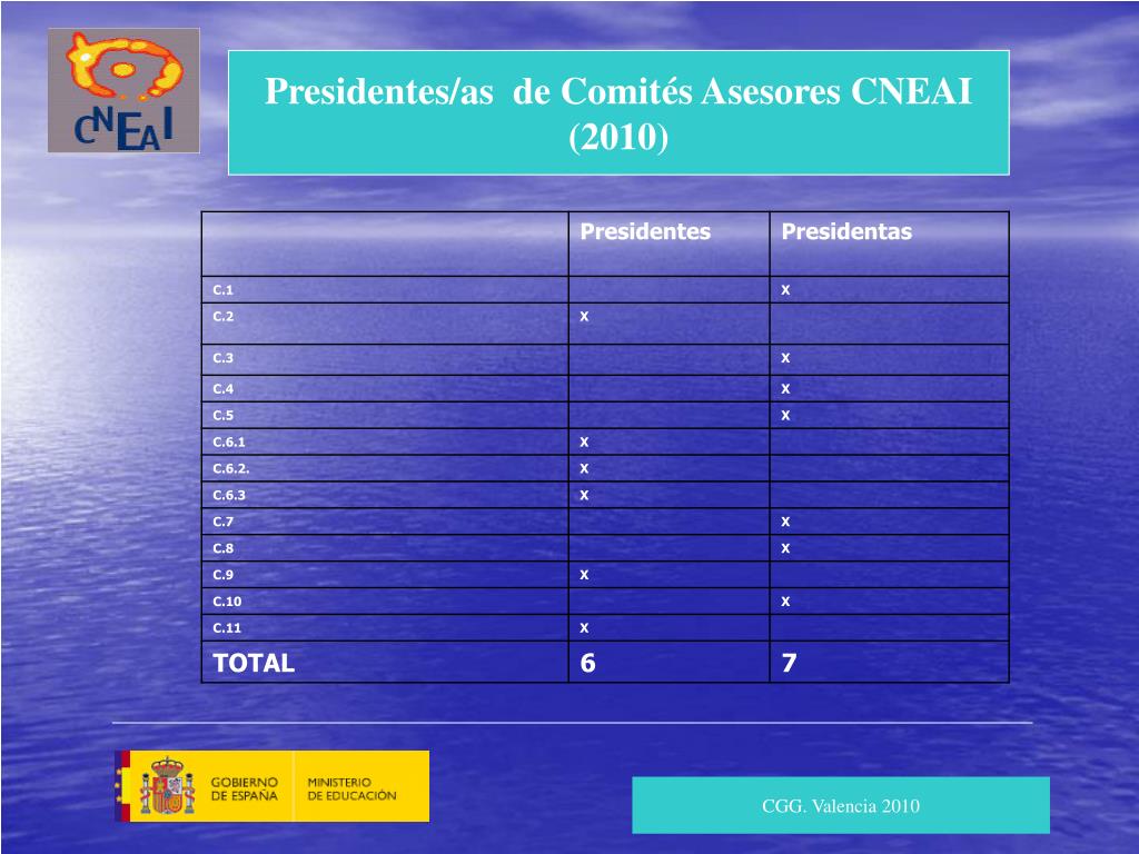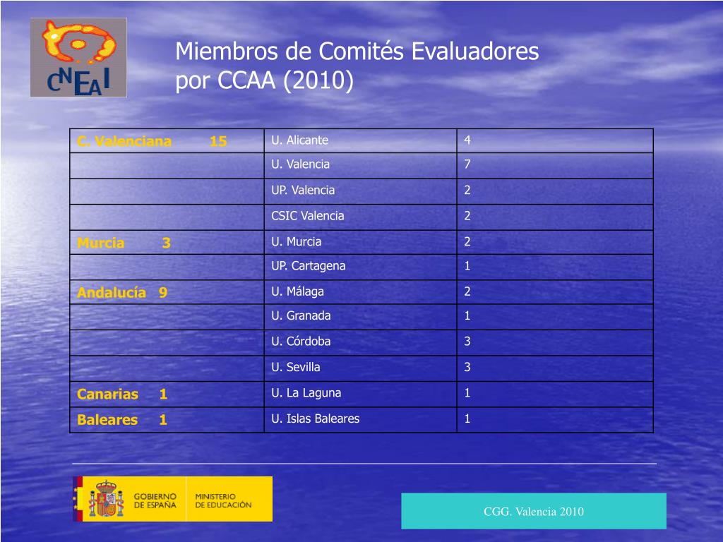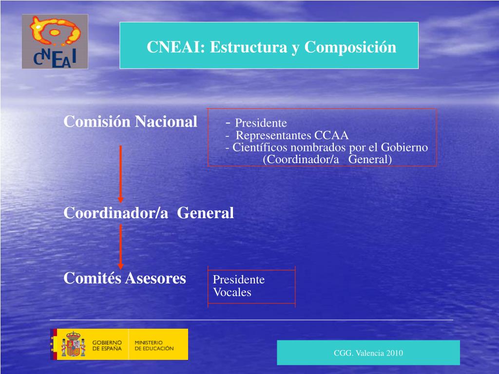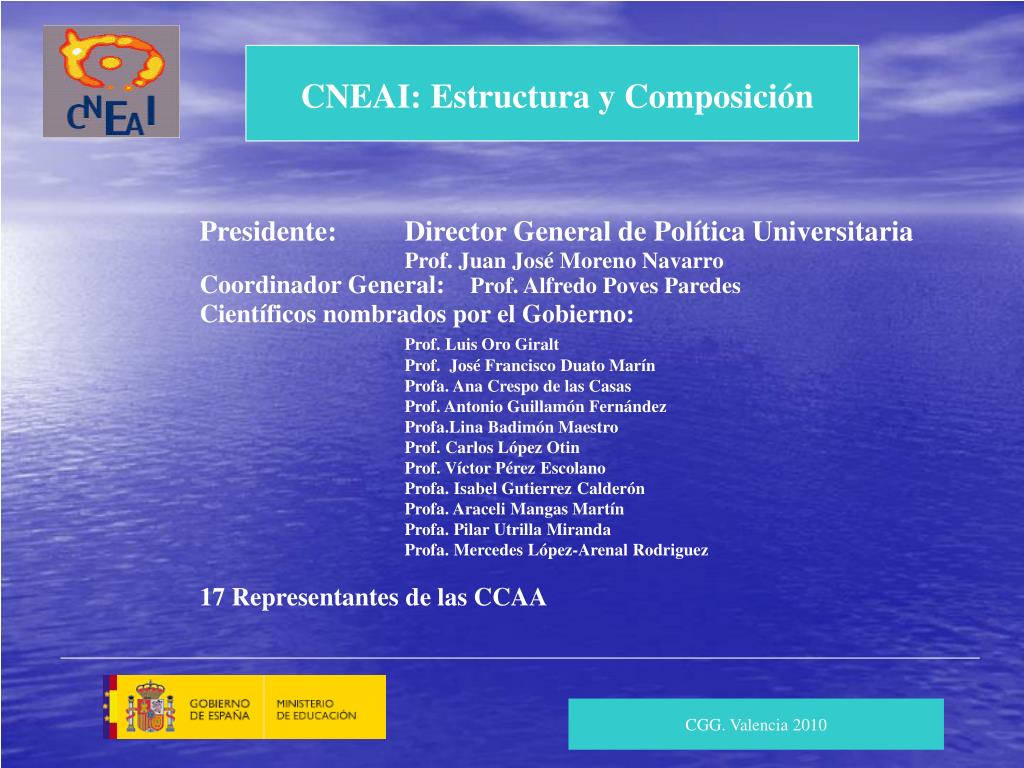CNEAI: Estructura y Composición Presidente: Director General de Política Universitaria Prof. Juan José Moreno Navarro Coordinador General: Prof. Alfredo Poves Paredes Científicos nombrados por el Gobierno: Prof. Luis Oro Giralt Prof. José Francisco Duato Marín Profa. Ana Crespo de las Casas Prof. Antonio Guillamón Fernández Profa.Lina Badimón Maestro Prof. Carlos López Otin Prof. Víctor Pérez Escolano Profa. Isabel Gutierrez Calderón Profa. Araceli Mangas Martín Profa. Pilar Utrilla Miranda Profa. Mercedes López-Arenal Rodriguez 17 Representantes de las CCAA CGG. Valencia 2010
