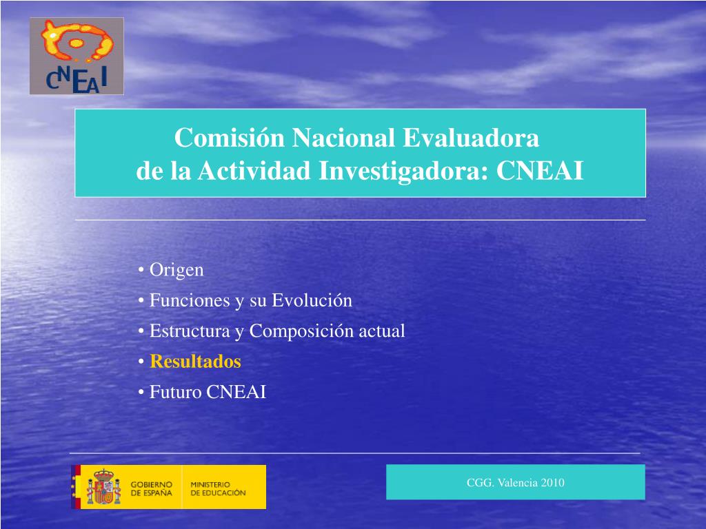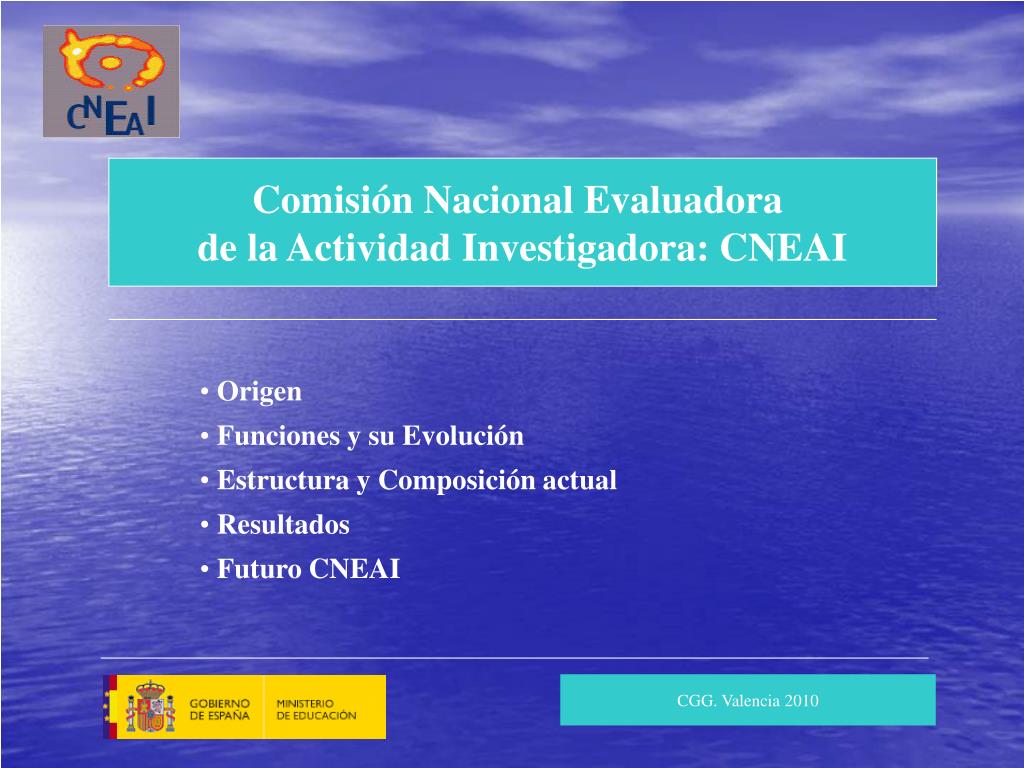 Comisión Nacional Evaluadora de la Actividad Investigadora: CNEAI • Origen • Funciones y su Evolución • Estructura y Composición actual • Resultados • Futuro CNEAI CGG. Valencia 2010