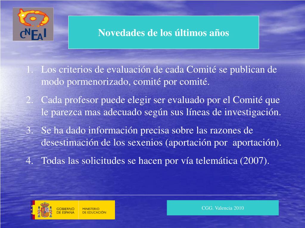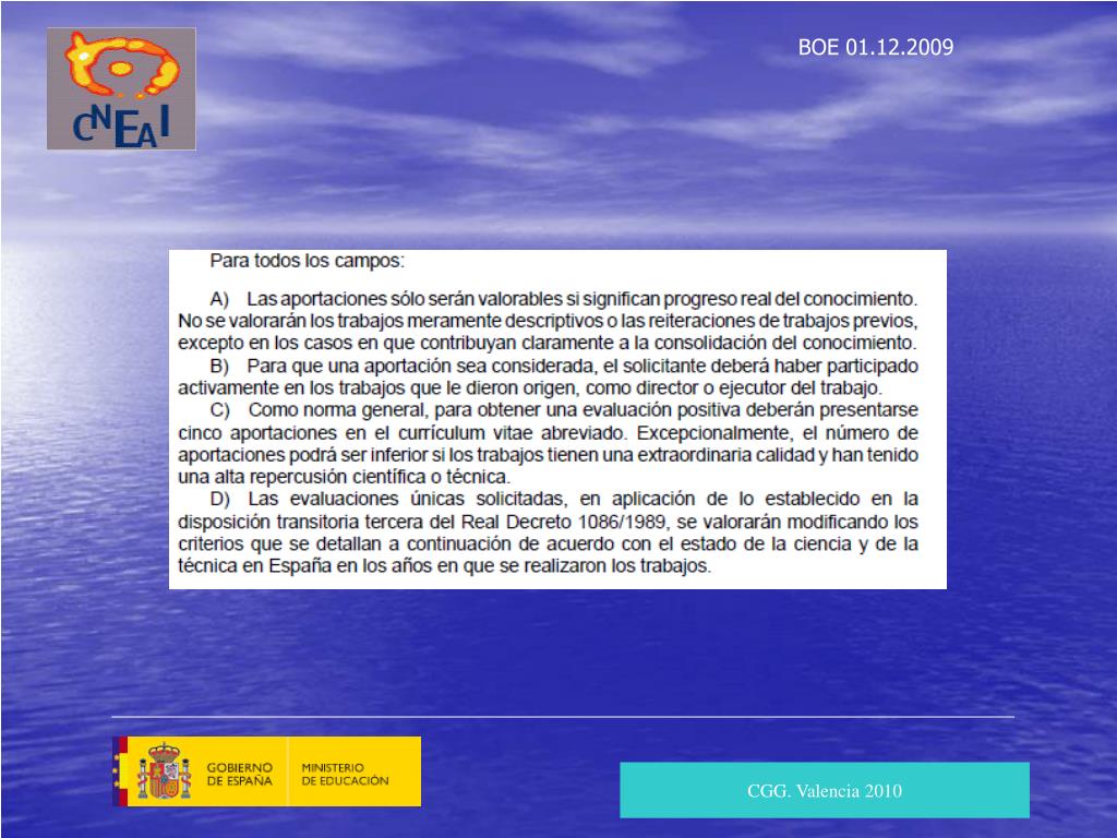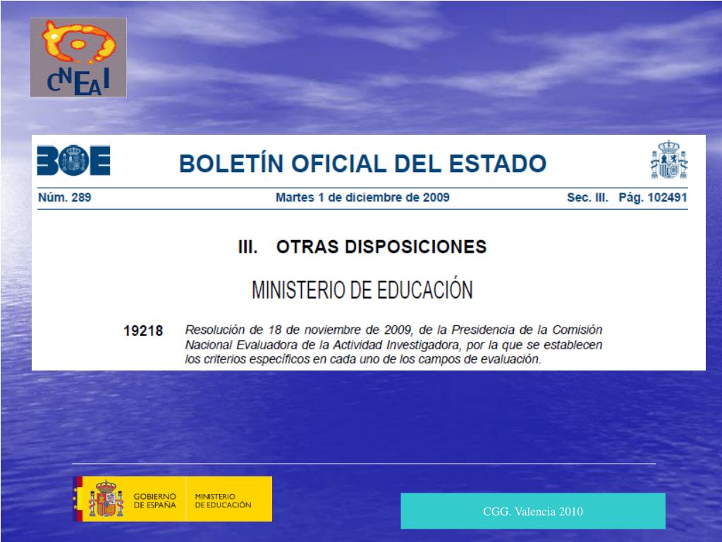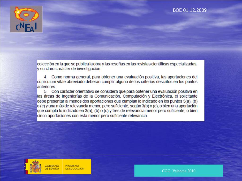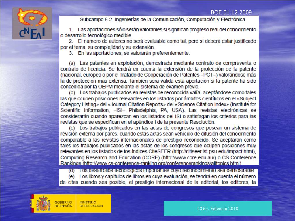 Novedades de los últimos años • Los criterios de evaluación de cada Comité se publican de modo pormenorizado, comité por comité. • Cada profesor puede elegir ser evaluado por el Comité que le parezca mas adecuado según sus líneas de investigación. • Se ha dado información precisa sobre las razones de desestimación de los sexenios (aportación por aportación). • Todas las solicitudes se hacen por vía telemática (2007). CGG. Valencia 2010