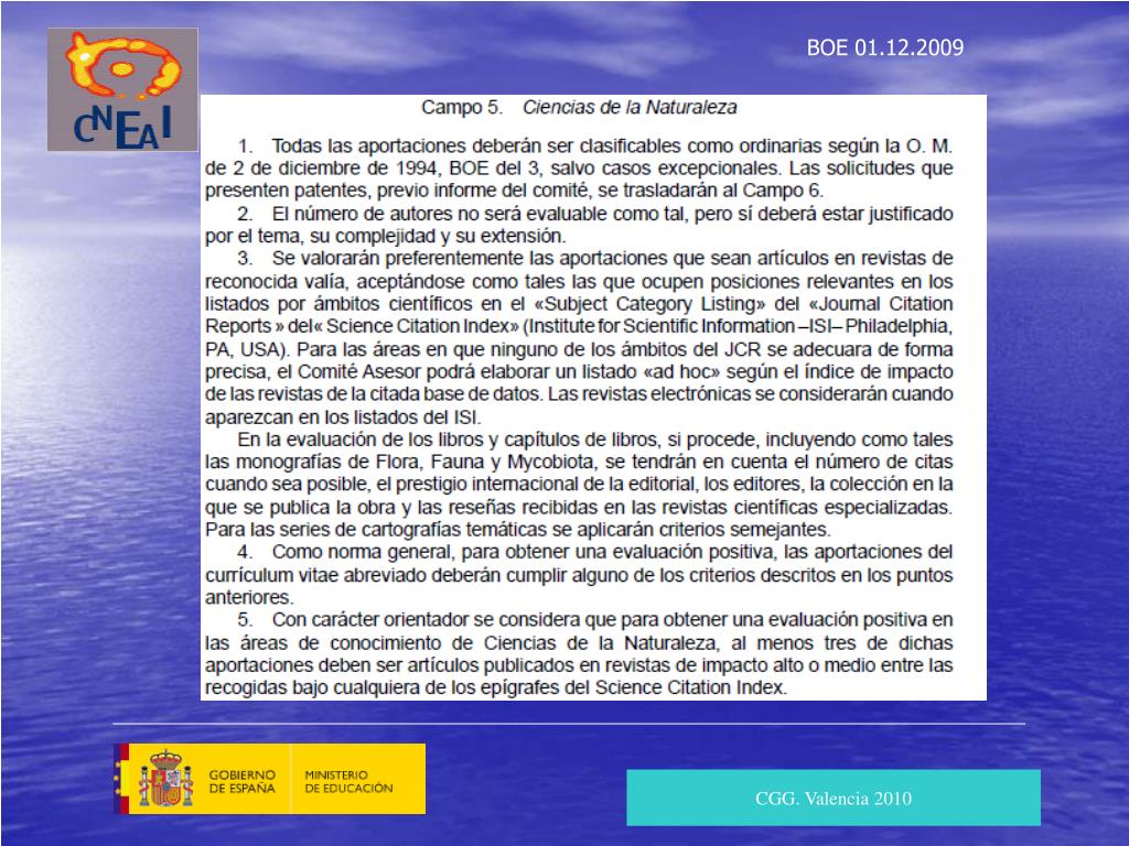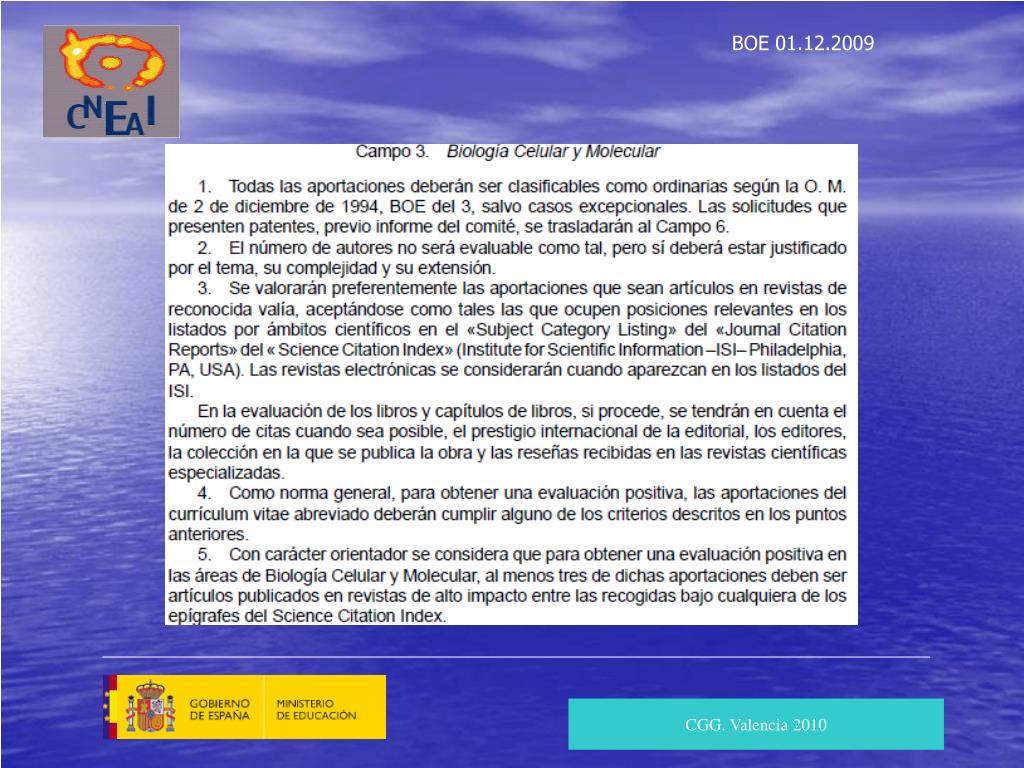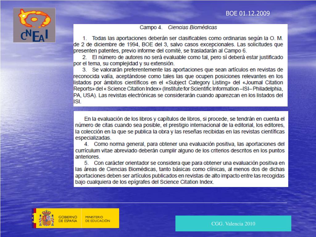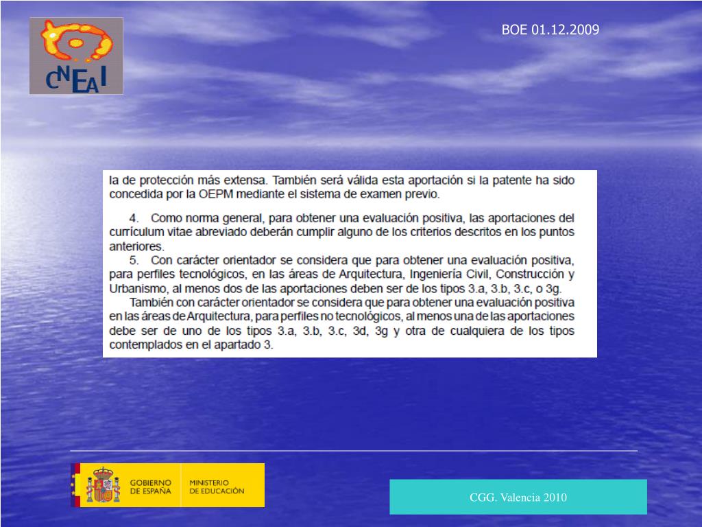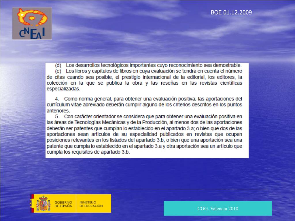Novedades de los últimos años • Los criterios de evaluación de cada Comité se publican de modo pormenorizado, comité por comité. • Cada profesor puede elegir ser evaluado por el Comité que le parezca mas adecuado según sus líneas de investigación. • Se ha dado información precisa sobre las razones de desestimación de los sexenios (aportación por aportación). • Todas las solicitudes se hacen por vía telemática (2007). CGG. Valencia 2010