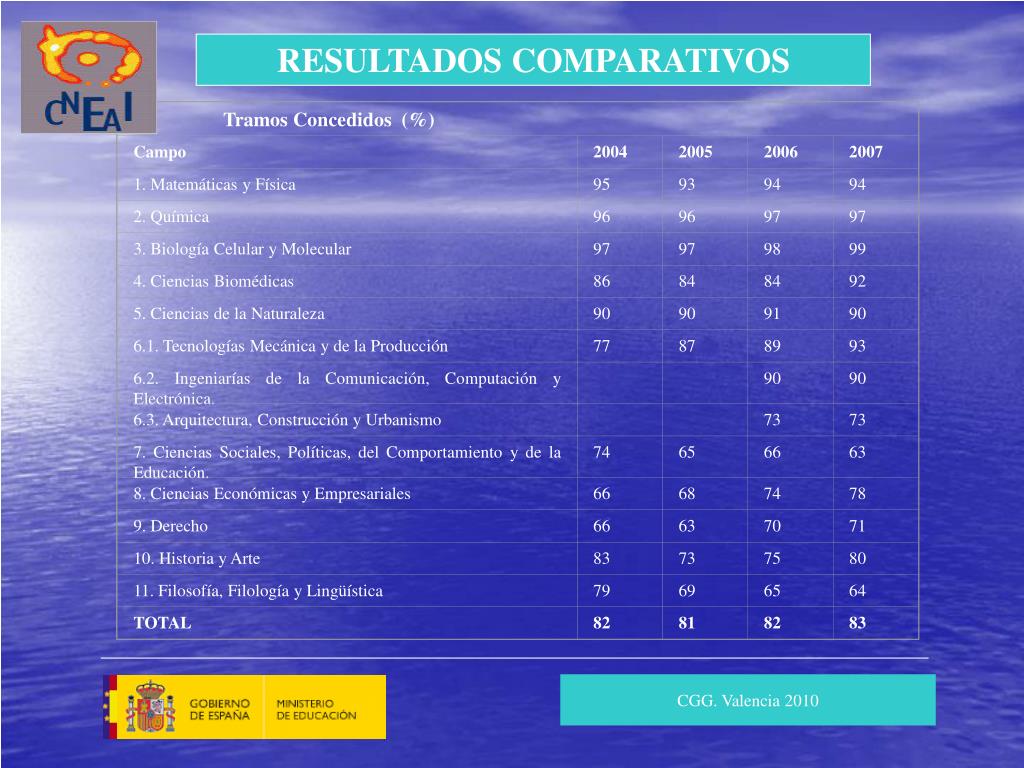 RESULTADOS COMPARATIVOS Tramos Concedidos (%) Campo 2004 2005 2006 2007 1. Matemáticas y Física 95 93 94 94 2. Química 96 96 97 97 3. Biología Celular y Molecular 97 97 98 99 4. Ciencias Biomédicas 86 84 84 92 5. Ciencias de la Naturaleza 90 90 91 90 6.1. Tecnologías Mecánica y de la Producción 77 87 89 93 6.2. Ingeniarías de la Comunicación, Computación y Electrónica. 90 90 6.3. Arquitectura, Construcción y Urbanismo 73 73 7. Ciencias Sociales, Políticas, del Comportamiento y de la Educación. 74 65 66 63 8. Ciencias Económicas y Empresariales 66 68 74 78 9. Derecho 66 63 70 71 10. Historia y Arte 83 73 75 80 11. Filosofía, Filología y Lingüística 79 69 65 64 TOTAL 82 81 82 83 RESULTADOS COMPARATIVOS CGG. Valencia 2010