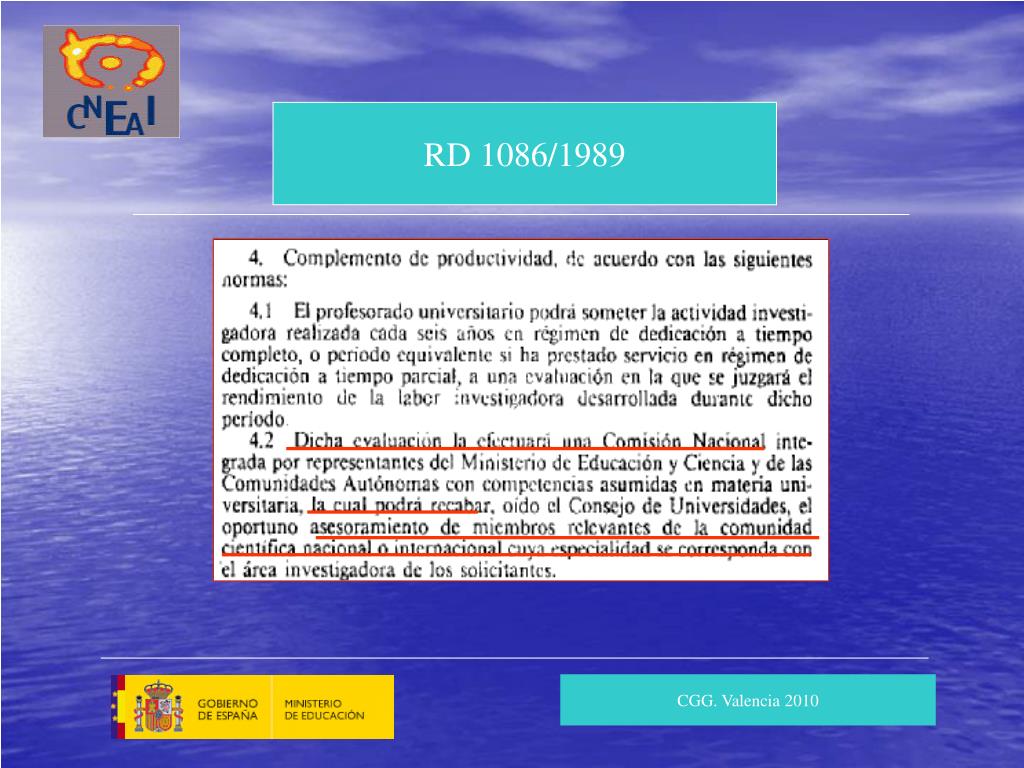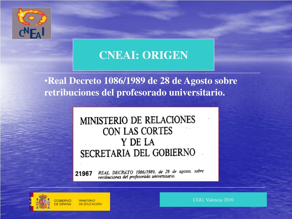 CNEAI: ORIGEN • Real Decreto 1086/1989 de 28 de Agosto sobre retribuciones del profesorado universitario. CGG. Valencia 2010