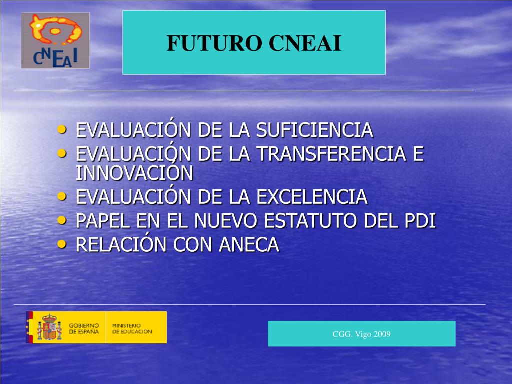 FUTURO CNEAI • EVALUACIÓN DE LA SUFICIENCIA • EVALUACIÓN DE LA TRANSFERENCIA E INNOVACIÓN • EVALUACIÓN DE LA EXCELENCIA • PAPEL EN EL NUEVO ESTATUTO DEL PDI • RELACIÓN CON ANECA CGG. Vigo 2009