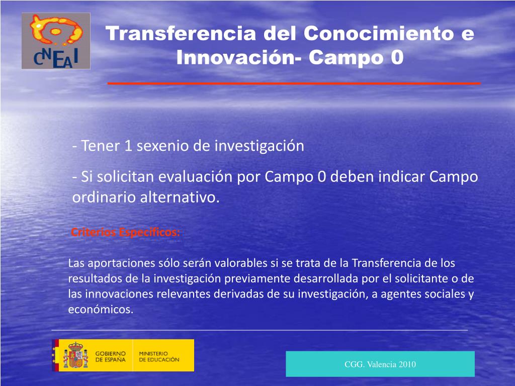 Transferencia del Conocimiento e Innovación- Campo 0 • Tener 1 sexenio de investigación • Si solicitan evaluación por Campo 0 deben indicar Campo ordinario alternativo. Criterios Específicos: Las aportaciones sólo serán valorables si se trata de la Transferencia de los resultados de la investigación previamente desarrollada por el solicitante o de las innovaciones relevantes derivadas de su investigación, a agentes sociales y económicos. CGG. Valencia 2010