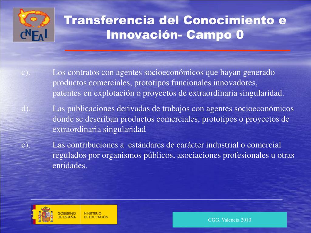 Transferencia del Conocimiento e Innovación- Campo 0 c). Los contratos con agentes socioeconómicos que hayan generado productos comerciales, prototipos funcionales innovadores, patentes en explotación o proyectos de extraordinaria singularidad. d). Las publicaciones derivadas de trabajos con agentes socioeconómicos donde se describan productos comerciales, prototipos o proyectos de extraordinaria singularidad e). Las contribuciones a estándares de carácter industrial o comercial regulados por organismos públicos, asociaciones profesionales u otras entidades. CGG. Valencia 2010