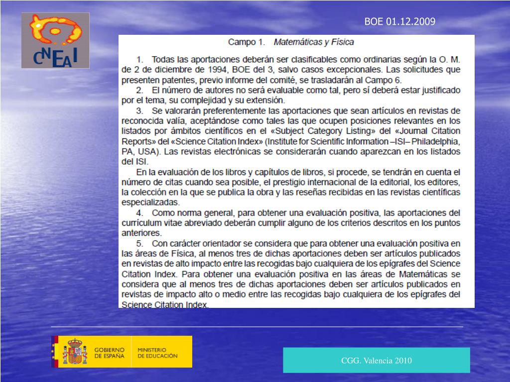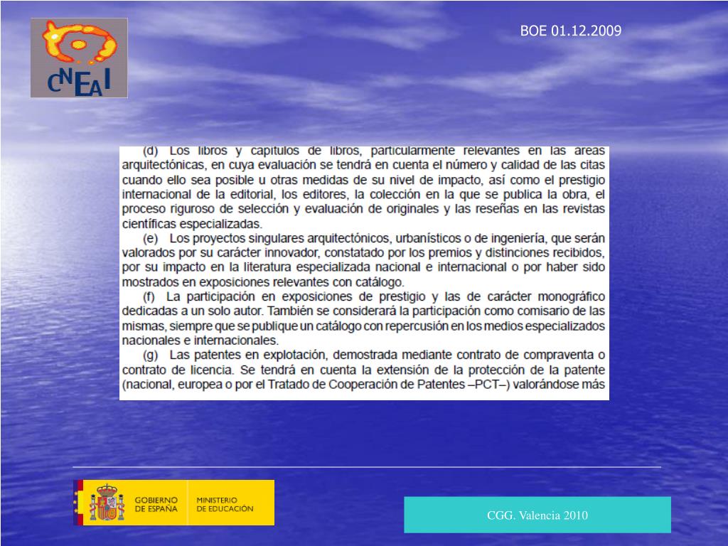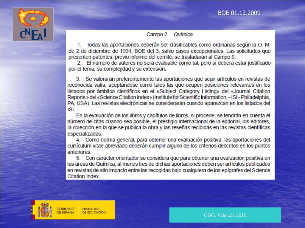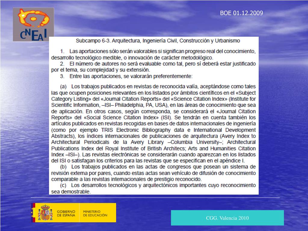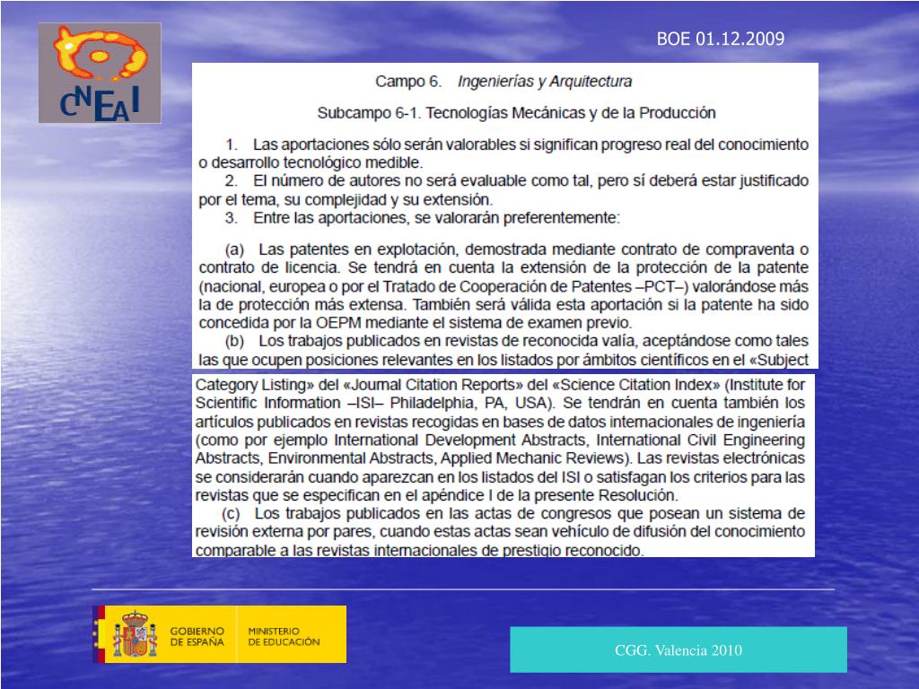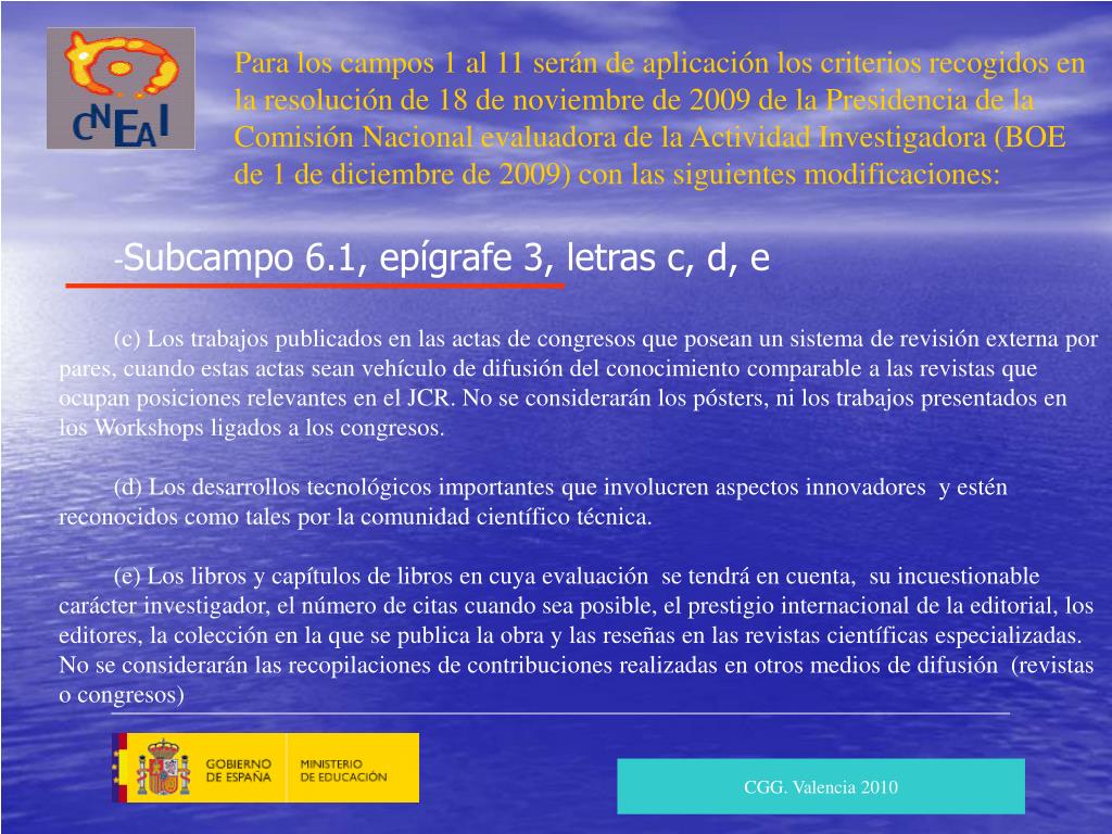 Para los campos 1 al 11 serán de aplicación los criterios recogidos en la resolución de 18 de noviembre de 2009 de la Presidencia de la Comisión Nacional evaluadora de la Actividad Investigadora (BOE de 1 de diciembre de 2009) con las siguientes modificaciones: -Subcampo 6.1, epígrafe 3, letras c, d, e (c) Los trabajos publicados en las actas de congresos que posean un sistema de revisión externa por pares, cuando estas actas sean vehículo de difusión del conocimiento comparable a las revistas que ocupan posiciones relevantes en el JCR. No se considerarán los pósters, ni los trabajos presentados en los Workshops ligados a los congresos. (d) Los desarrollos tecnológicos importantes que involucren aspectos innovadores y estén reconocidos como tales por la comunidad científico técnica. (e) Los libros y capítulos de libros en cuya evaluación se tendrá en cuenta, su incuestionable carácter investigador, el número de citas cuando sea posible, el prestigio internacional de la editorial, los editores, la colección en la que se publica la obra y las reseñas en las revistas científicas especializadas. No se considerarán las recopilaciones de contribuciones realizadas en otros medios de difusión (revistas o congresos) CGG. Valencia 2010