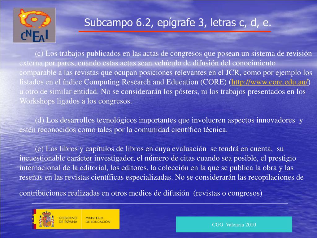 Subcampo 6.2, epígrafe 3, letras c, d, e. (c) Los trabajos publicados en las actas de congresos que posean un sistema de revisión externa por pares, cuando estas actas sean vehículo de difusión del conocimiento comparable a las revistas que ocupan posiciones relevantes en el JCR, como por ejemplo los listados en el índice Computing Research and Education (CORE) (http://www.core.edu.au/) u otro de similar entidad. No se considerarán los pósters, ni los trabajos presentados en los Workshops ligados a los congresos. (d) Los desarrollos tecnológicos importantes que involucren aspectos innovadores y estén reconocidos como tales por la comunidad científico técnica. (e) Los libros y capítulos de libros en cuya evaluación se tendrá en cuenta, su incuestionable carácter investigador, el número de citas cuando sea posible, el prestigio internacional de la editorial, los editores, la colección en la que se publica la obra y las reseñas en las revistas científicas especializadas. No se considerarán las recopilaciones de contribuciones realizadas en otros medios de difusión (revistas o congresos) CGG. Valencia 2010