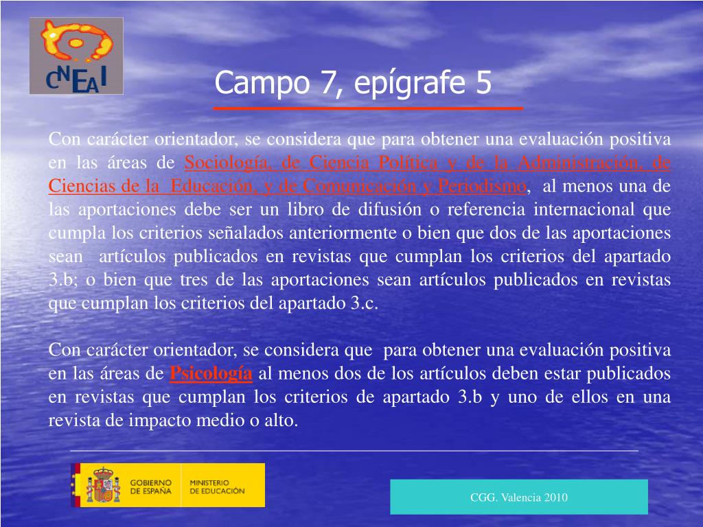 Campo 7, epígrafe 5 Con carácter orientador, se considera que para obtener una evaluación positiva en las áreas de Sociología, de Ciencia Política y de la Administración, de Ciencias de la Educación, y de Comunicación y Periodismo, al menos una de las aportaciones debe ser un libro de difusión o referencia internacional que cumpla los criterios señalados anteriormente o bien que dos de las aportaciones sean artículos publicados en revistas que cumplan los criterios del apartado 3.b; o bien que tres de las aportaciones sean artículos publicados en revistas que cumplan los criterios del apartado 3.c. Con carácter orientador, se considera que para obtener una evaluación positiva en las áreas de Psicología al menos dos de los artículos deben estar publicados en revistas que cumplan los criterios de apartado 3.b y uno de ellos en una revista de impacto medio o alto. CGG. Valencia 2010