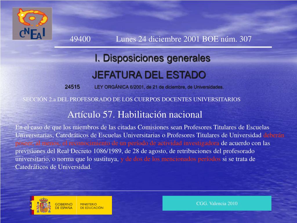 49400 Lunes 24 diciembre 2001 BOE núm. 307 I. Disposiciones generales JEFATURA DEL ESTADO 24515 LEY ORGÁNICA 6/2001, de 21 de diciembre, de Universidades. SECCIÓN 2.a DEL PROFESORADO DE LOS CUERPOS DOCENTES UNIVERSITARIOS Artículo 57. Habilitación nacional En el caso de que los miembros de las citadas Comisiones sean Profesores Titulares de Escuelas Universitarias, Catedráticos de Escuelas Universitarias o Profesores Titulares de Universidad deberán poseer, al menos, el reconocimiento de un período de actividad investigadora de acuerdo con las previsiones del Real Decreto 1086/1989, de 28 de agosto, de retribuciones del profesorado universitario, o norma que lo sustituya, y de dos de los mencionados períodos si se trata de Catedráticos de Universidad. CGG. Valencia 2010