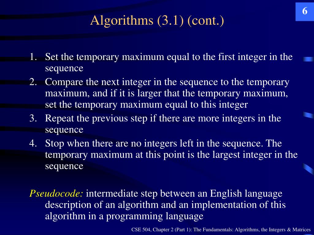 Algorithms (3.1) (cont.) • Set the temporary maximum equal to the first integer in the sequence • Compare the next integer in the sequence to the temporary maximum, and if it is larger that the temporary maximum, set the temporary maximum equal to this integer • Repeat the previous step if there are more integers in the sequence • Stop when there are no integers left in the sequence. The temporary maximum at this point is the largest integer in the sequence Pseudocode: intermediate step between an English language description of an algorithm and an implementation of this algorithm in a programming language CSE 504, Chapter 2 (Part 1): The Fundamentals: Algorithms, the Integers & Matrices