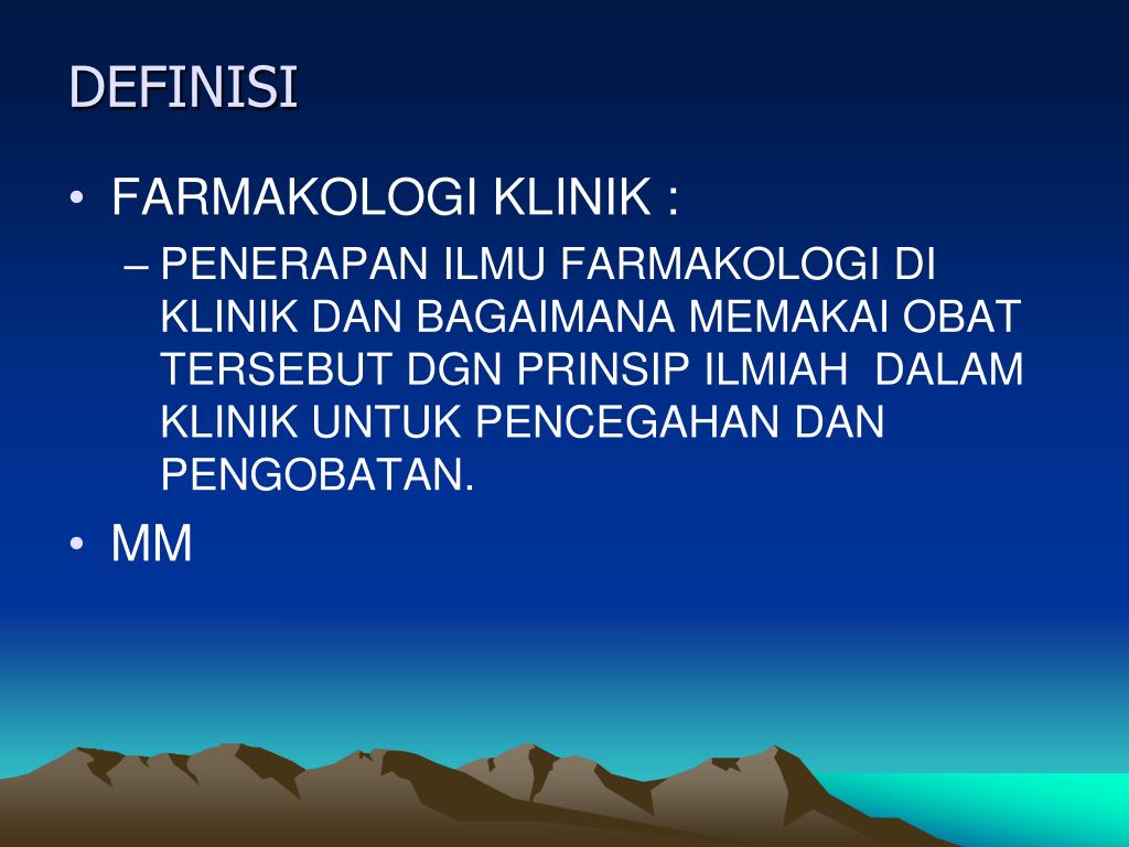 DEFINISI • FARMAKOLOGI KLINIK : • PENERAPAN ILMU FARMAKOLOGI DI KLINIK DAN BAGAIMANA MEMAKAI OBAT TERSEBUT DGN PRINSIP ILMIAH DALAM KLINIK UNTUK PENCEGAHAN DAN PENGOBATAN. • MM