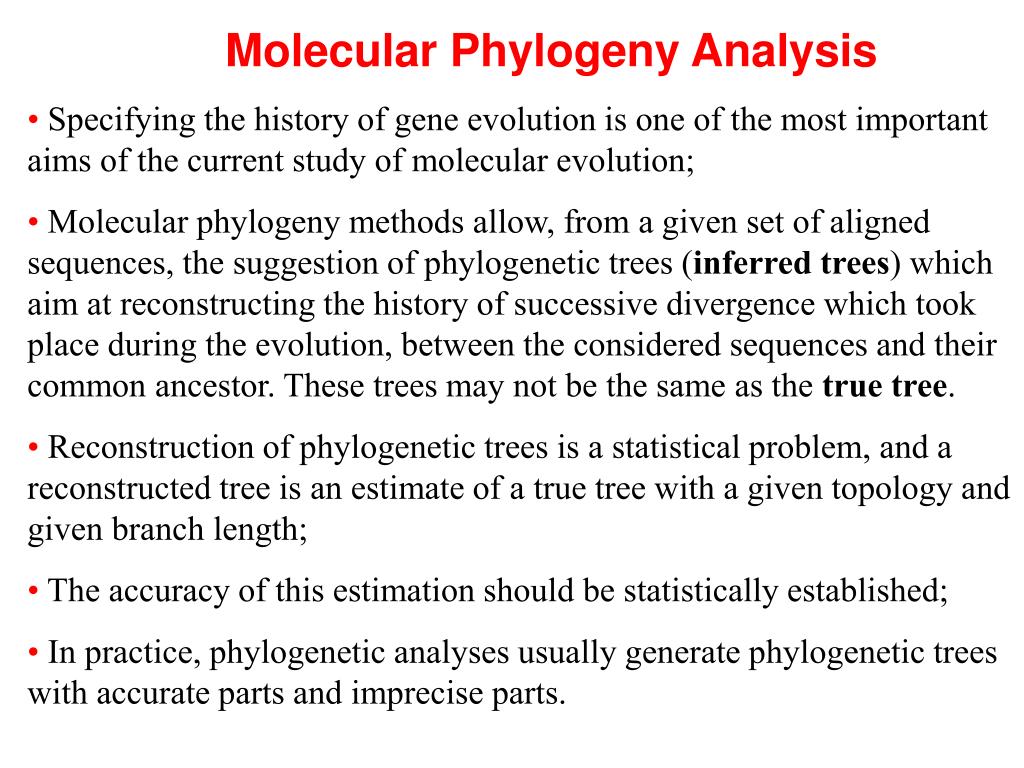 Molecular Phylogeny Analysis • Specifying the history of gene evolution is one of the most important aims of the current study of molecular evolution; • Molecular phylogeny methods allow, from a given set of aligned sequences, the suggestion of phylogenetic trees (inferred trees) which aim at reconstructing the history of successive divergence which took place during the evolution, between the considered sequences and their common ancestor. These trees may not be the same as the true tree. • Reconstruction of phylogenetic trees is a statistical problem, and a reconstructed tree is an estimate of a true tree with a given topology and given branch length; • The accuracy of this estimation should be statistically established; • In practice, phylogenetic analyses usually generate phylogenetic trees with accurate parts and imprecise parts.