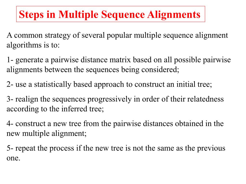 Steps in Multiple Sequence Alignments A common strategy of several popular multiple sequence alignment algorithms is to: 1- generate a pairwise distance matrix based on all possible pairwise alignments between the sequences being considered; 2- use a statistically based approach to construct an initial tree; 3- realign the sequences progressively in order of their relatedness according to the inferred tree; 4- construct a new tree from the pairwise distances obtained in the new multiple alignment; 5- repeat the process if the new tree is not the same as the previous one.