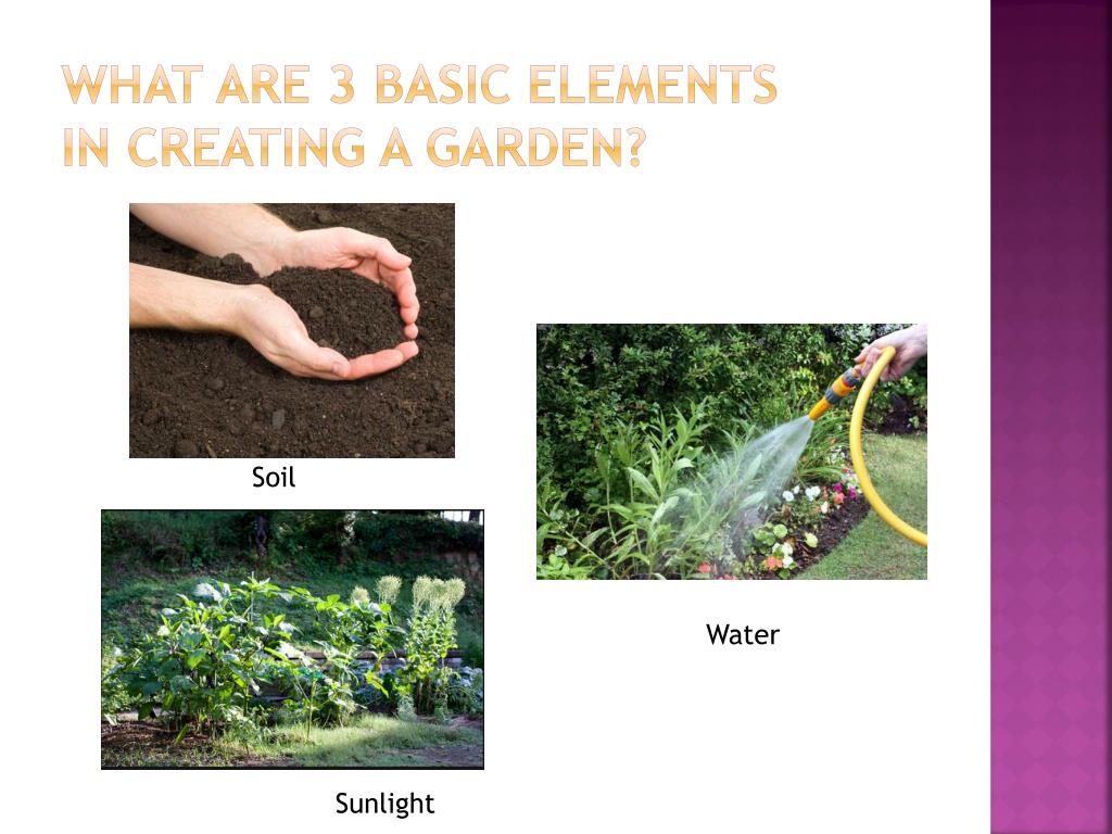 What Are 3 basic elements in creating a garden? Soil Water Sunlight