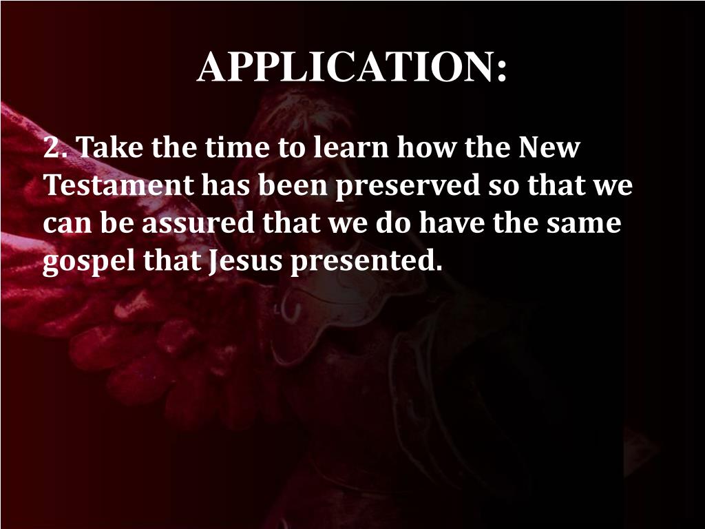 APPLICATION: 2. Take the time to learn how the New Testament has been preserved so that we can be assured that we do have the same gospel that Jesus presented.