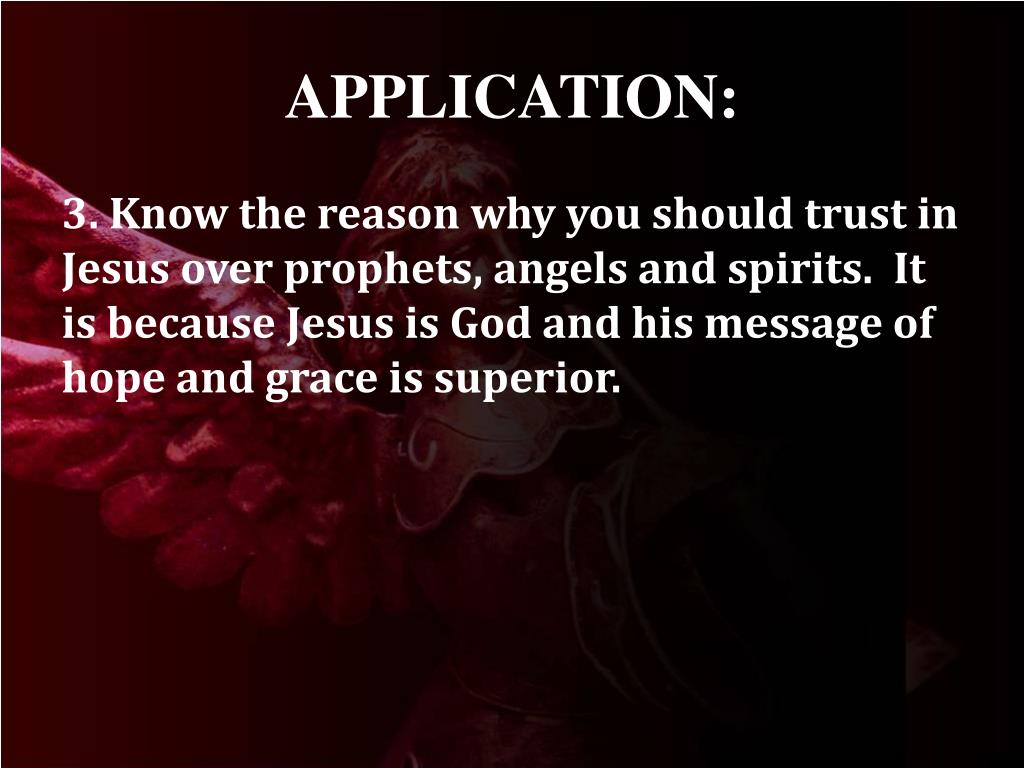 APPLICATION: 3. Know the reason why you should trust in Jesus over prophets, angels and spirits. It is because Jesus is God and his message of hope and grace is superior.