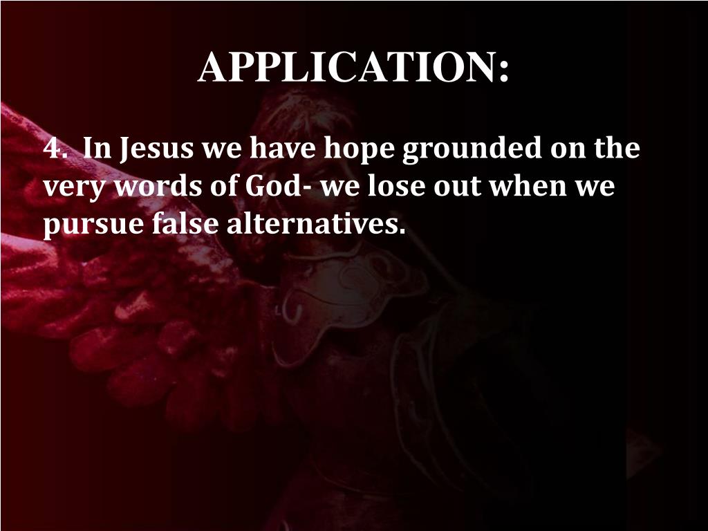 APPLICATION: 4. In Jesus we have hope grounded on the very words of God- we lose out when we pursue false alternatives.