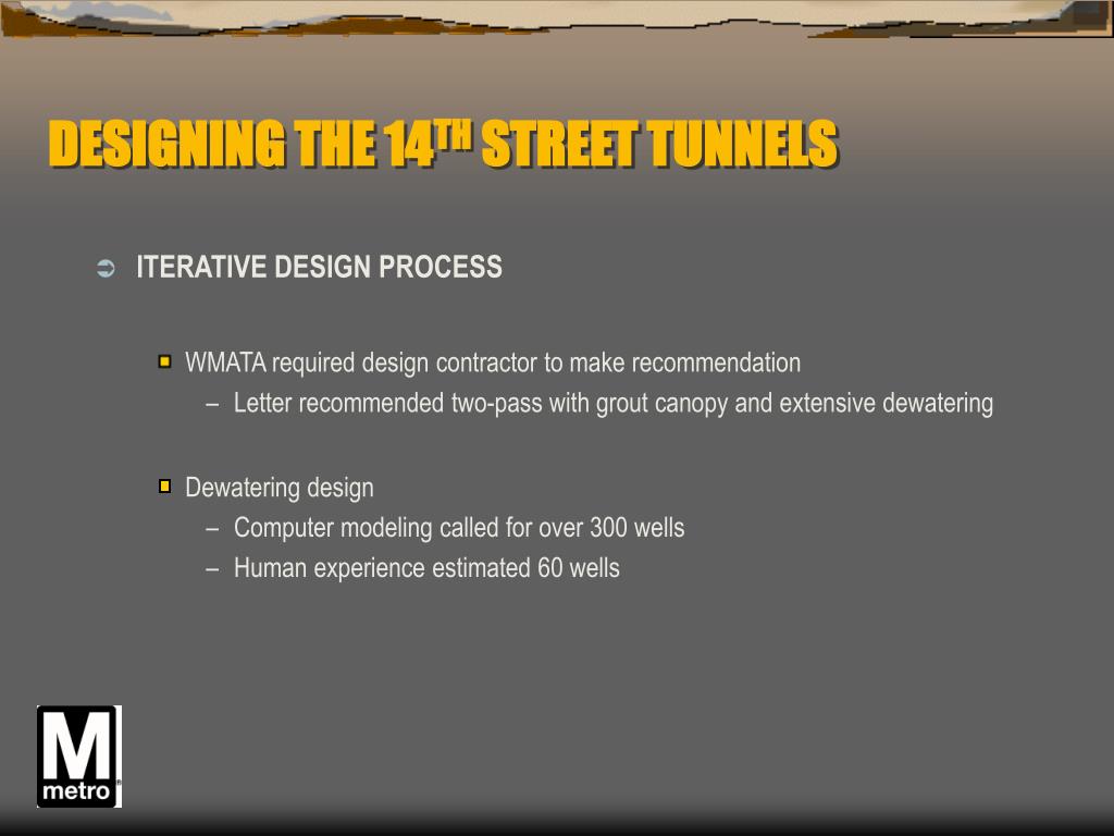 DESIGNING THE 14TH STREET TUNNELS • ITERATIVE DESIGN PROCESS • WMATA required design contractor to make recommendation • Letter recommended two-pass with grout canopy and extensive dewatering • Dewatering design • Computer modeling called for over 300 wells • Human experience estimated 60 wells