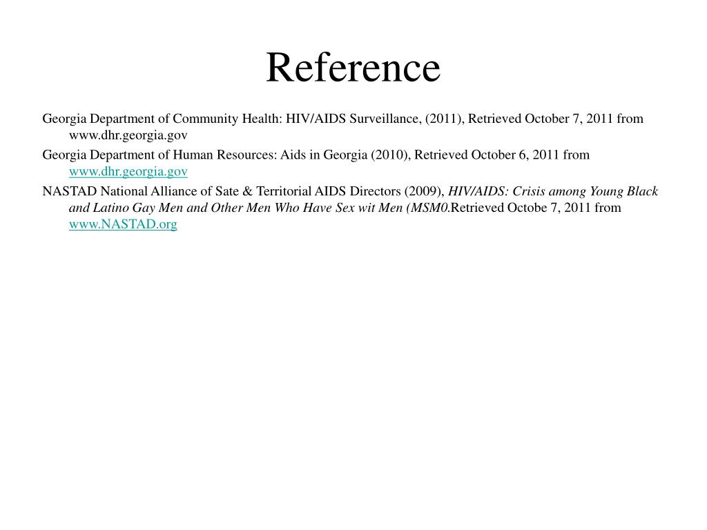 Reference Georgia Department of Community Health: HIV/AIDS Surveillance, (2011), Retrieved October 7, 2011 from www.dhr.georgia.gov Georgia Department of Human Resources: Aids in Georgia (2010), Retrieved October 6, 2011 from www.dhr.georgia.gov NASTAD National Alliance of Sate & Territorial AIDS Directors (2009), HIV/AIDS: Crisis among Young Black and Latino Gay Men and Other Men Who Have Sex wit Men (MSM0.Retrieved Octobe 7, 2011 from www.NASTAD.org