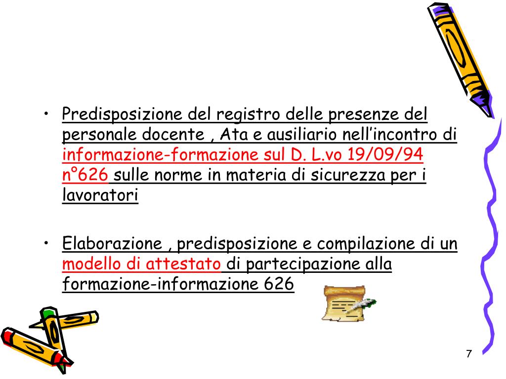 Predisposizione del registro delle presenze del personale docente , Ata e ausiliario nell’incontro di informazione-formazione sul D. L.vo 19/09/94 n°626 sulle norme in materia di sicurezza per i lavoratori • Elaborazione , predisposizione e compilazione di un modello di attestato di partecipazione alla formazione-informazione 626