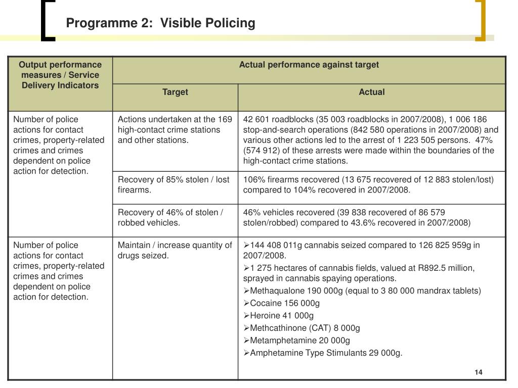 Programme 2: Visible Policing 2 - 4 These cannot be measured as a proportion of the total incidents of crime because, for example, the number and quantity of illegal firearms, stolen vehicles, drugs and goods that move both in and out of the country illegally cannot be determined. The numbers of interventions in respect of high and medium-risk operations are subject to various circumstances and cannot be determined.