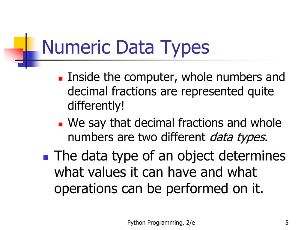 Numeric Data Types • Inside the computer, whole numbers and decimal fractions are represented quite differently! • We say that decimal fractions and whole numbers are two different data types. • The data type of an object determines what values it can have and what operations can be performed on it. Python Programming, 2/e