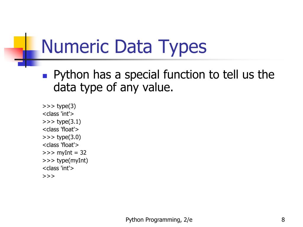 Numeric Data Types • Python has a special function to tell us the data type of any value. >>> type(3) <class 'int'> >>> type(3.1) <class 'float'> >>> type(3.0) <class 'float'> >>> myInt = 32 >>> type(myInt) <class 'int'> >>> Python Programming, 2/e
