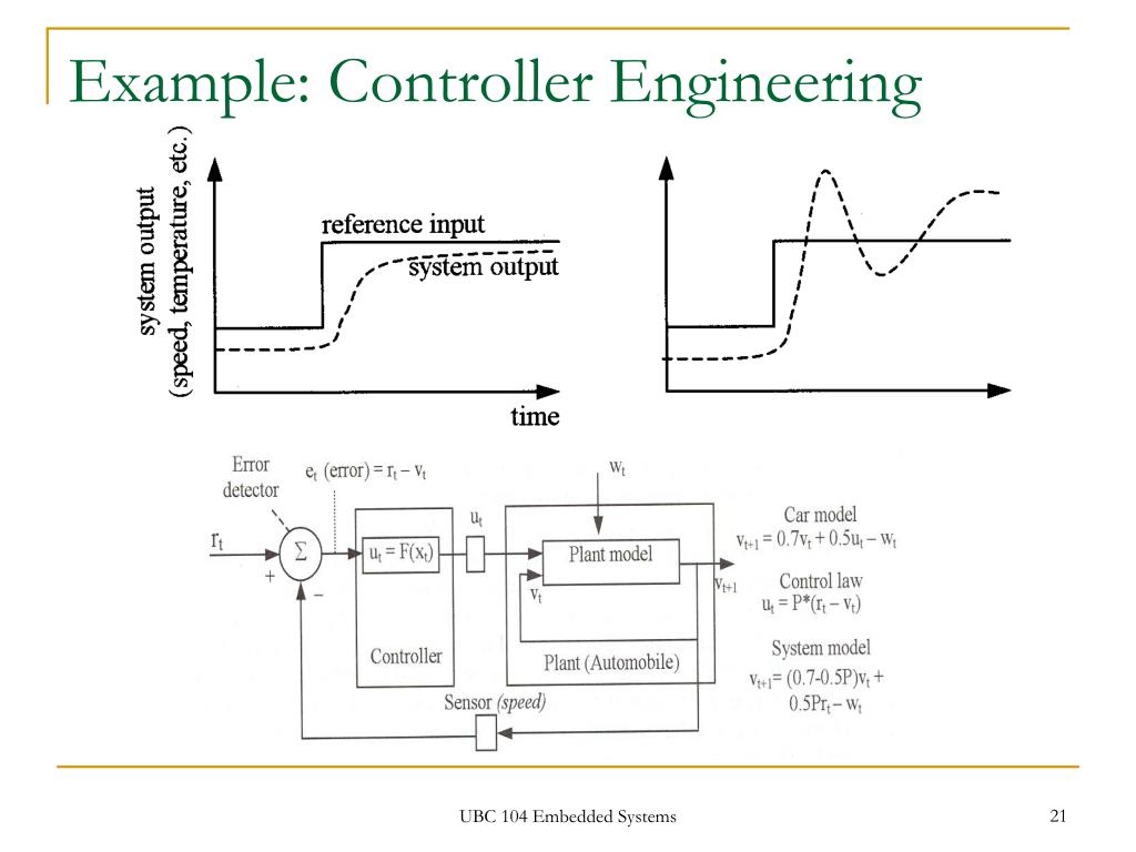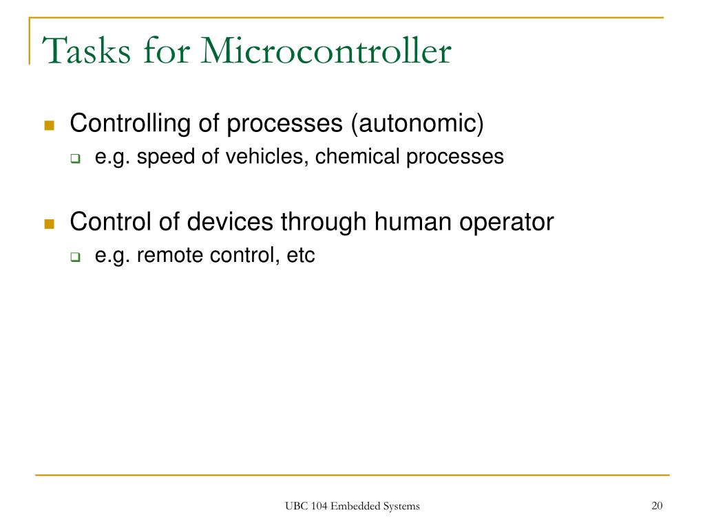 Tasks for Microcontroller • Controlling of processes (autonomic) • e.g. speed of vehicles, chemical processes • Control of devices through human operator • e.g. remote control, etc UBC 104 Embedded Systems