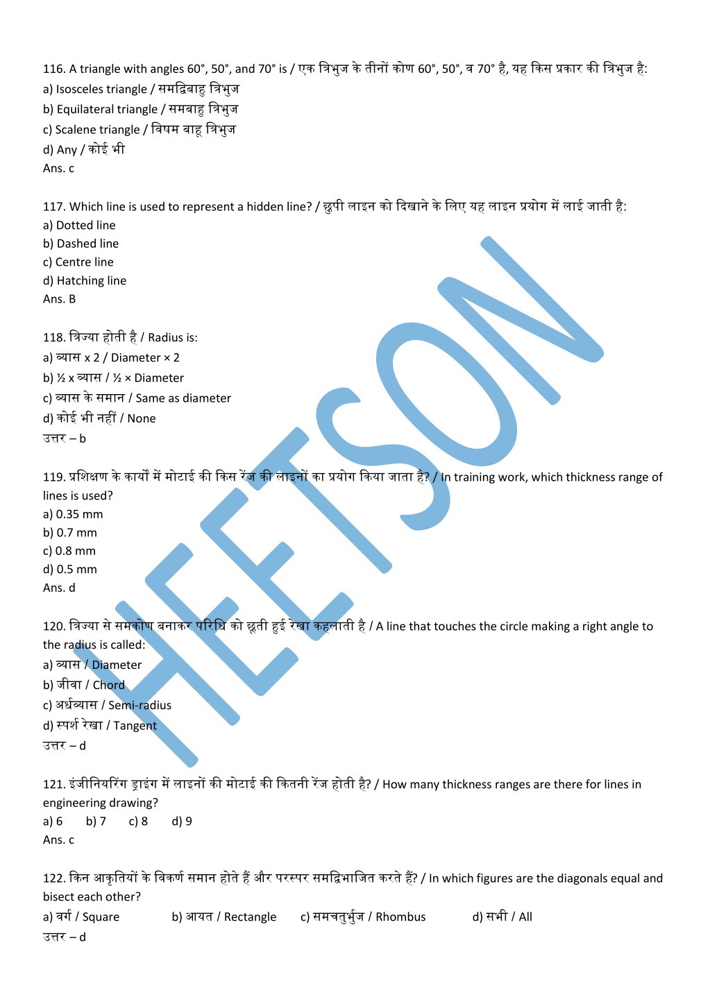 116. A triangle with angles 60°, 50°, and 70° is / एक स्त्रभुज के त़ीनों कोण 60°, 50°, व 70° है, यह ककस प्रकार की स्त्रभुज है: a) Isosceles triangle / समस्द्वबाहू स्त्रभुज b) Equilateral triangle / समबाहू स्त्रभुज c) Scalene triangle / स्वषम बाहृ स्त्रभुज d) Any / कोइ भ़ी Ans. c 117. Which line is used to represent a hidden line? / छुप़ी लाआन को कदखाने के स्लए यह लाआन प्रयोग में लाइ जात़ी है: a) Dotted line b) Dashed line c) Centre line d) Hatching line Ans. B 118. स्त्रज्या होत़ी है / Radius is: a) व्यास x 2 / Diameter × 2 b) ½ x व्यास / ½ × Diameter c) व्यास के समान / Same as diameter d) कोइ भ़ी नहीं / None ईत्तर – b 119. प्रस्शक्षण के कायों में मोिाइ की ककस रेंज की लाआनों का प्रयोग ककया जाता है? / In training work, which thickness range of lines is used? a) 0.35 mm b) 0.7 mm c) 0.8 mm d) 0.5 mm Ans. d 120. स्त्रज्या से समकोण बनाकर पट्टरस्ध को छूत़ी हूइ रेखा कहलात़ी है / A line that touches the circle making a right angle to the radius is called: a) व्यास / Diameter b) ज़ीवा / Chord c) ऄधडव्यास / Semi-radius d) टपशड रेखा / Tangent ईत्तर – d 121. आंज़ीस्नयटरग ड्राआंग में लाआनों की मोिाइ की ककतऩी रेंज होत़ी है? / How many thickness ranges are there for lines in engineering drawing? a) 6 b) 7 c) 8 d) 9 Ans. c 122. ककन अकृस्तयों के स्वकणड समान होते हैं और परटपर समस्द्वभास्जत करते हैं? / In which figures are the diagonals equal and bisect each other? a) वगड / Square b) अयत / Rectangle c) समचतुभुडज / Rhombus ईत्तर – d d) सभ़ी / All