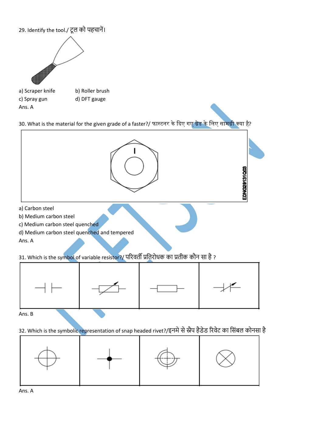 29. Identify the tool./ टूलकोपहचानें। a) Scraper knife c) Spray gun Ans. A 30. What is the material for the given grade of a faster?/फाटिनर के कदए गए ग्रेर् के स्लए सामग्ऱी क्या है? b) Roller brush d) DFT gauge a) Carbon steel b) Medium carbon steel c) Medium carbon steel quenched d) Medium carbon steel quenched and tempered Ans. A 31. Which is the symbol of variable resistor?/ पररवतीप्रर्तरोधककाप्रतीककौनसाहै? Ans. B 32. Which is the symbolic representation of snap headed rivet?/इनमेसेस्नैपहैडेडररवेटकार्संबलकोनसाहै Ans. A