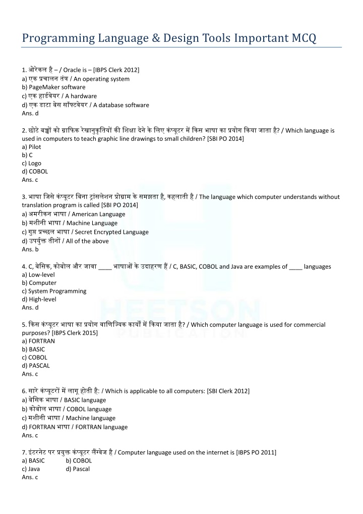 Design tools and programming language MCQ in Hindi. Objective Questions with Answers PDF for all Computer Related Competitive Exams.