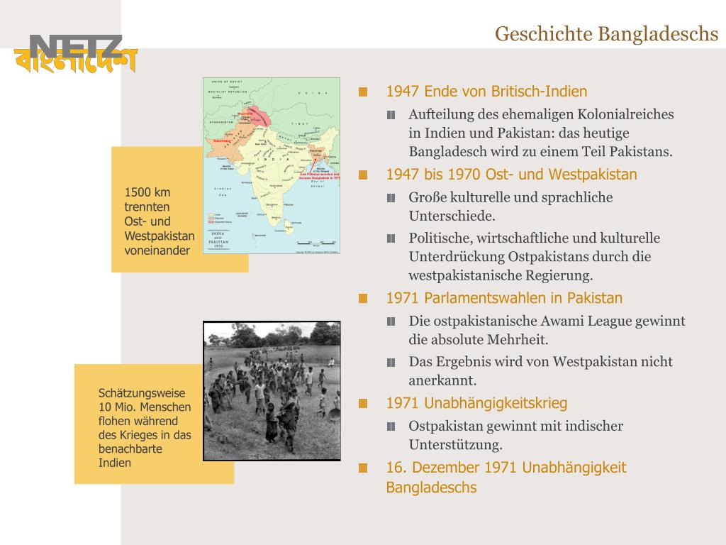 Geschichte Bangladeschs • 1947 Ende von Britisch-Indien • Aufteilung des ehemaligen Kolonialreiches in Indien und Pakistan: das heutige Bangladesch wird zu einem Teil Pakistans. • 1947 bis 1970 Ost- und Westpakistan • Große kulturelle und sprachliche Unterschiede. • Politische, wirtschaftliche und kulturelle Unterdrückung Ostpakistans durch die westpakistanische Regierung. • 1971 Parlamentswahlen in Pakistan • Die ostpakistanische Awami League gewinnt die absolute Mehrheit. • Das Ergebnis wird von Westpakistan nicht anerkannt. • 1971 Unabhängigkeitskrieg • Ostpakistan gewinnt mit indischer Unterstützung. • 16. Dezember 1971 Unabhängigkeit Bangladeschs 1500 km trennten Ost- und Westpakistan voneinander Schätzungsweise 10 Mio. Menschen flohen während des Krieges in das benachbarte Indien