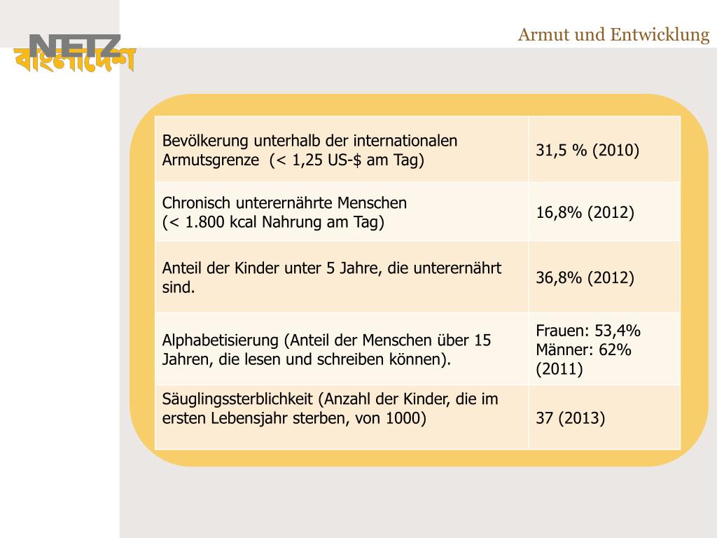 Bevölkerung Bangladesch ist der am dichtesten besiedelte Flächenstaat der Erde. Bangladesch ist 144.000 km² groß, das entspricht etwa der doppelten Größe Bayerns. Die Einwohnerzahl beträgt über 160 Millionen. Zum Vergleich, in Deutschland leben rund 82 Millionen Menschen.