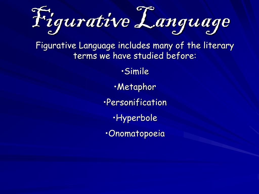 Figurative Language • Figurative Language includes many of the literary terms we have studied before: • Simile • Metaphor • Personification • Hyperbole • Onomatopoeia