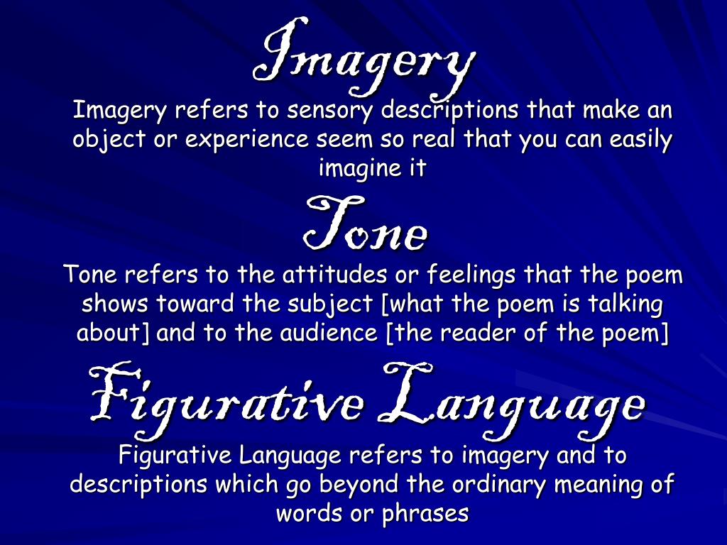Imagery Imagery refers to sensory descriptions that make an object or experience seem so real that you can easily imagine it Tone Tone refers to the attitudes or feelings that the poem shows toward the subject [what the poem is talking about] and to the audience [the reader of the poem] Figurative Language Figurative Language refers to imagery and to descriptions which go beyond the ordinary meaning of words or phrases