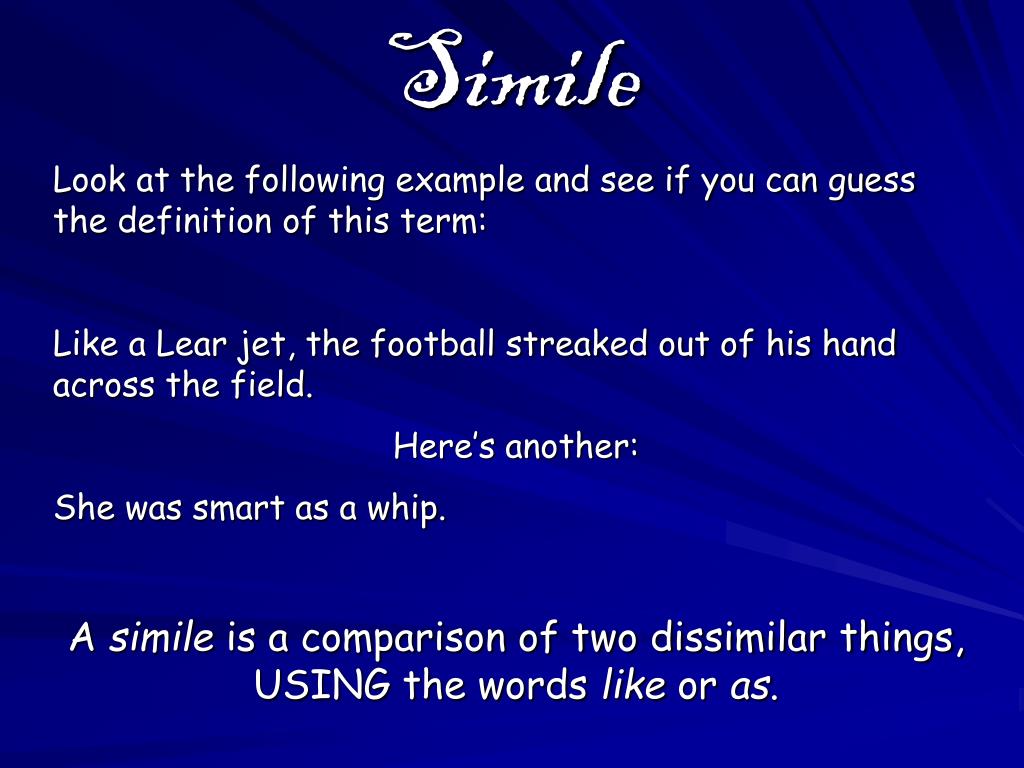 Simile Look at the following example and see if you can guess the definition of this term: Like a Lear jet, the football streaked out of his hand across the field. Here’s another: She was smart as a whip. A simile is a comparison of two dissimilar things, USING the words like or as.