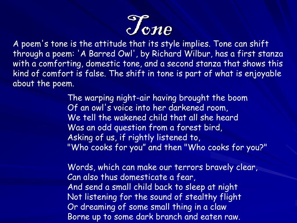 Tone A poem's tone is the attitude that its style implies. Tone can shift through a poem: 'A Barred Owl', by Richard Wilbur, has a first stanza with a comforting, domestic tone, and a second stanza that shows this kind of comfort is false. The shift in tone is part of what is enjoyable about the poem. The warping night-air having brought the boomOf an owl's voice into her darkened room,We tell the wakened child that all she heardWas an odd question from a forest bird, Asking of us, if rightly listened to,"Who cooks for you” and then "Who cooks for you?" Words, which can make our terrors bravely clear,Can also thus domesticate a fear,And send a small child back to sleep at nightNot listening for the sound of stealthy flightOr dreaming of some small thing in a clawBorne up to some dark branch and eaten raw.