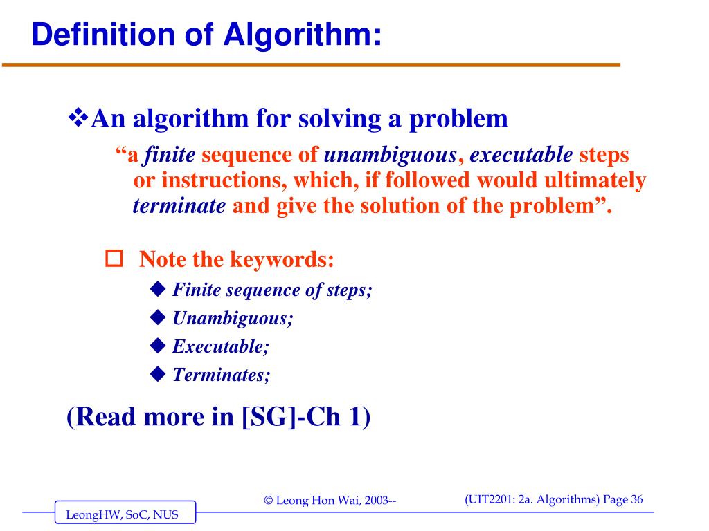 Definition of Algorithm: • An algorithm for solving a problem “a finite sequence of unambiguous, executable steps or instructions, which, if followed would ultimately terminate and give the solution of the problem”. • Note the keywords: • Finite sequence of steps; • Unambiguous; • Executable; • Terminates; (Read more in [SG]-Ch 1)