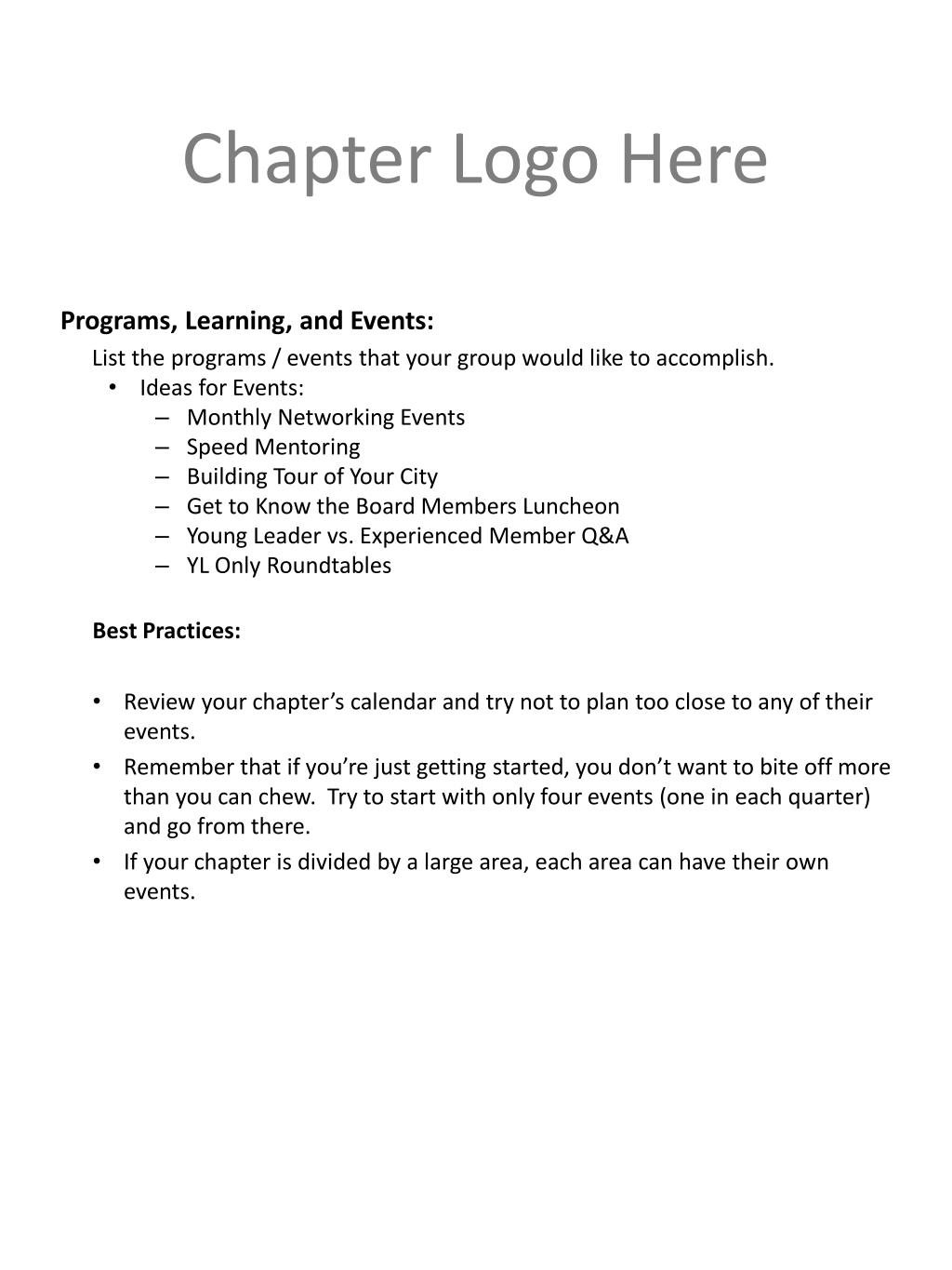 Chapter Logo Here Programs, Learning, and Events: List the programs / events that your group would like to accomplish. • Ideas for Events: • Monthly Networking Events • Speed Mentoring • Building Tour of Your City • Get to Know the Board Members Luncheon • Young Leader vs. Experienced Member Q&A • YL Only Roundtables Best Practices: • Review your chapter’s calendar and try not to plan too close to any of their events. • Remember that if you’re just getting started, you don’t want to bite off more than you can chew. Try to start with only four events (one in each quarter) and go from there. • If your chapter is divided by a large area, each area can have their own events.