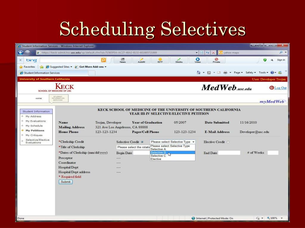 Scheduling Selectives • Quick Review: • Need 16 weeks of selectives • Selectives must be taken at USC • Selectives are 4 weeks in length • 1 List A, 1 List B, 2 from either List B or C