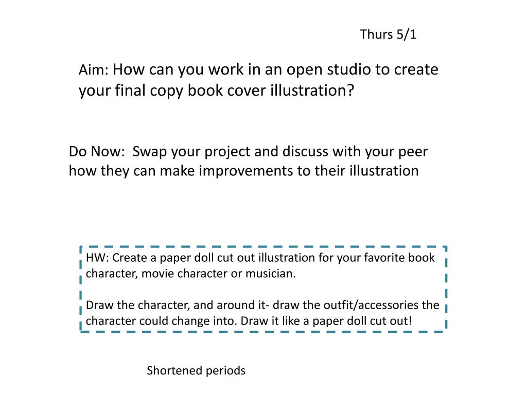 Thurs 5/1 Aim: How can you work in an open studio to create your final copy book cover illustration? Do Now: Swap your project and discuss with your peer how they can make improvements to their illustration HW: Create a paper doll cut out illustration for your favorite book character, movie character or musician. Draw the character, and around it- draw the outfit/accessories the character could change into. Draw it like a paper doll cut out! Shortened periods