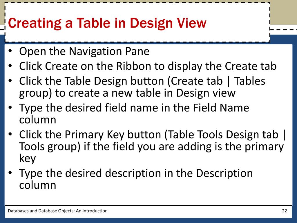 Creating a Table in Design View • Open the Navigation Pane • Click Create on the Ribbon to display the Create tab • Click the Table Design button (Create tab | Tables group) to create a new table in Design view • Type the desired field name in the Field Name column • Click the Primary Key button (Table Tools Design tab | Tools group) if the field you are adding is the primary key • Type the desired description in the Description column Databases and Database Objects: An Introduction