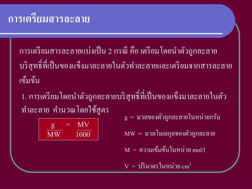 การเตรียมสารละลาย การเตรียมสารละลายแบ่งเป็น 2 กรณี คือ เตรียมโดยนำตัวถูกละลาย บริสุทธิ์ที่เป็นของแข็งมาละลายในตัวทำละลายและเตรียมจากสารละลาย เข้มข้น 1. การเตรียมโดยนำตัวถูกละลายบริสุทธิ์ที่เป็นของแข็งมาละลายในตัวทำละลาย คำนวณโดยใช้สูตร g = มวลของตัวถูกละลายในหน่วยกรัม MW = มวลโมเลกุลของตัวถูกละลาย M = ความเข้มข้นในหน่วย mol/l V = ปริมาตรในหน่วย cm3 g = MV MW 1000