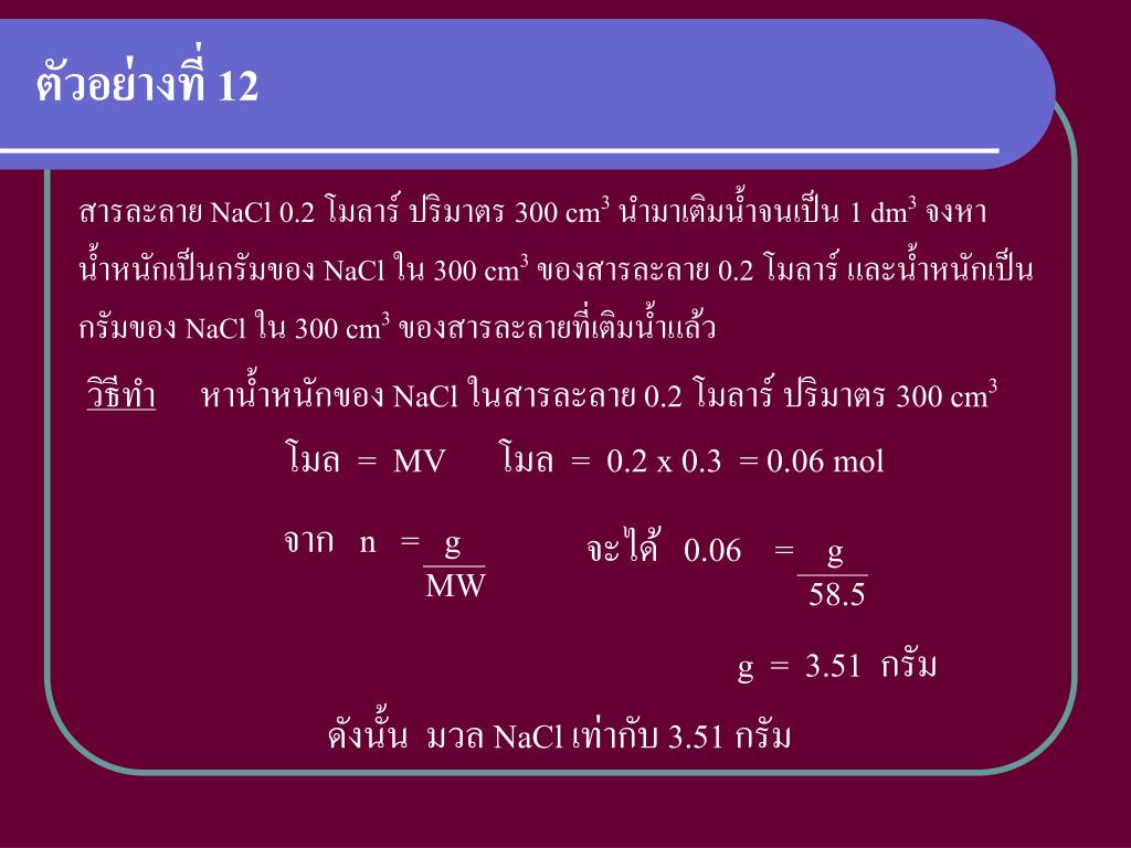 แทนค่า จะได้ 0.018 = g 58.5 จาก n = g MW ตัวอย่างที่ 12 (ต่อ) จาก n = MV จะได้ n = 0.06 x 0.3 = 0.018 mol g = 1.053 กรัม ดังนั้น มวล NaCl เท่ากับ 1.053 กรัม ตอบ