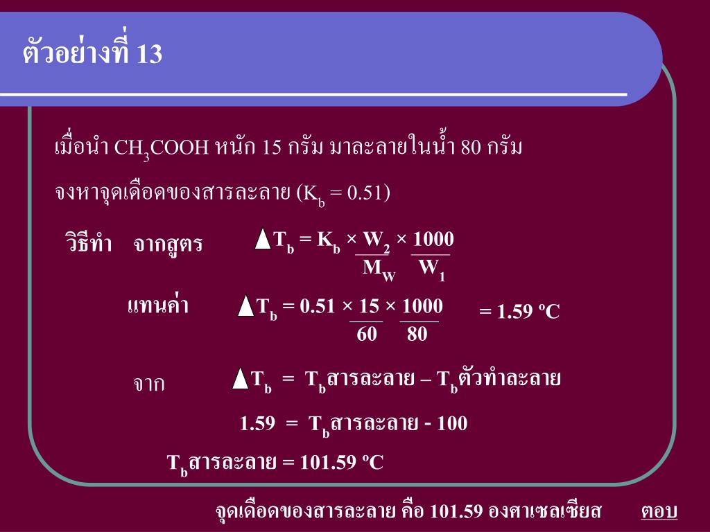 Tb = Kb × W2× 1000 Tb = 0.51 × 15 × 1000 60 80 Tb = Tbสารละลาย – Tbตัวทำละลาย MW W1 ตัวอย่างที่ 13 เมื่อนำ CH3COOH หนัก 15 กรัม มาละลายในน้ำ 80 กรัม จงหาจุดเดือดของสารละลาย (Kb = 0.51) วิธีทำ จากสูตร แทนค่า = 1.59 ºC จาก 1.59 = Tbสารละลาย - 100 Tbสารละลาย = 101.59 ºC จุดเดือดของสารละลาย คือ 101.59 องศาเซลเซียส ตอบ