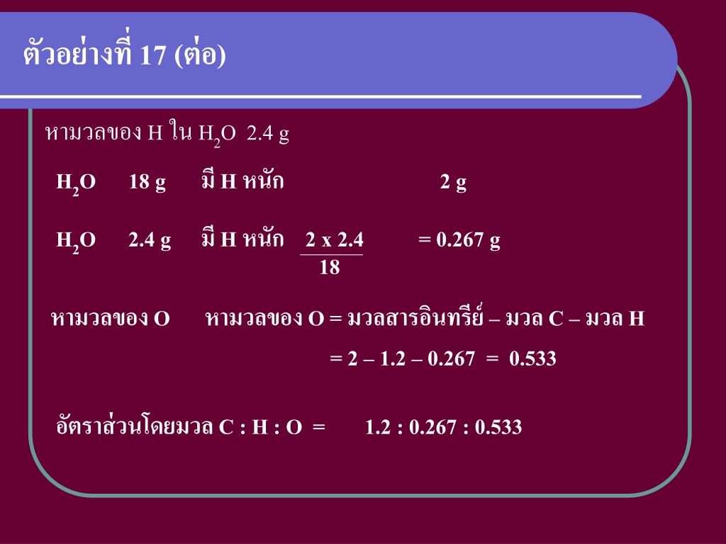 ตัวอย่างที่ 17 (ต่อ) หามวลของ H ใน H2O 2.4 g H2O 18 g มี H หนัก 2 g H2O 2.4 g มี H หนัก 2 x 2.4 = 0.267 g 18 หามวลของ O หามวลของ O = มวลสารอินทรีย์ – มวล C – มวล H = 2 – 1.2 – 0.267 = 0.533 อัตราส่วนโดยมวล C : H : O = 1.2 : 0.267 : 0.533