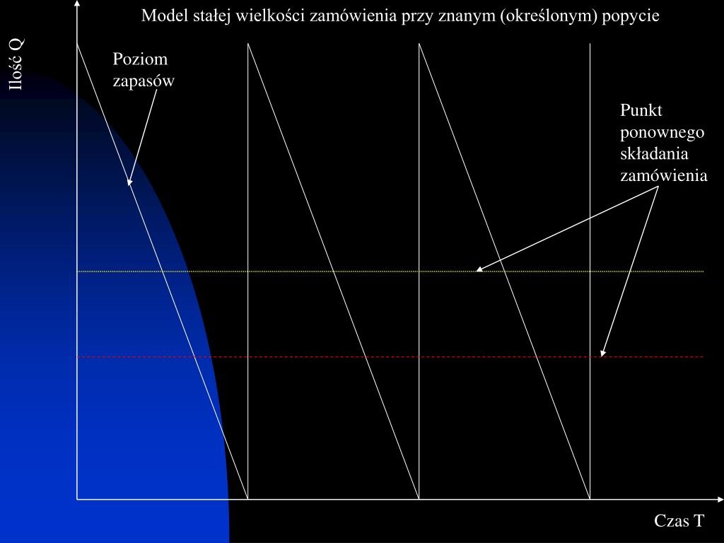 Model stałej wielkości zamówienia przy znanym (określonym) popycie Ilość Q Poziom zapasów Punkt ponownego składania zamówienia Czas T